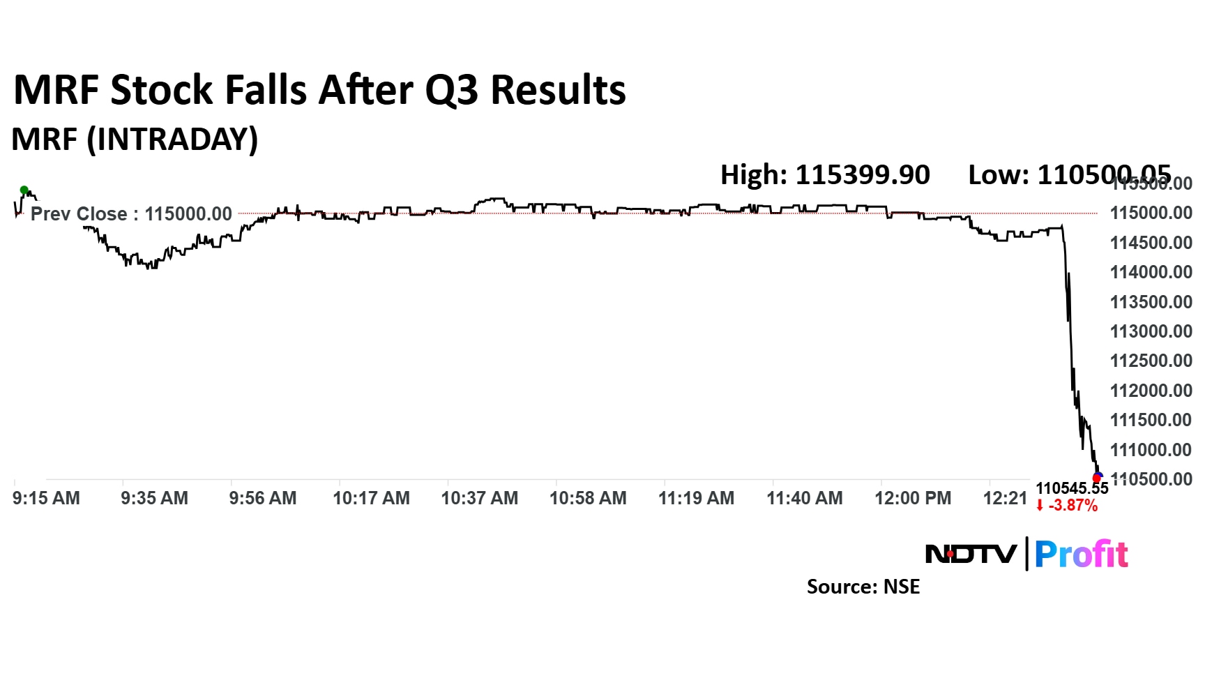 MRF Ltd.'s stock declined nearly 4% on Thursday as the company's third-quarter profit fell.(Source: NDTV Profit)