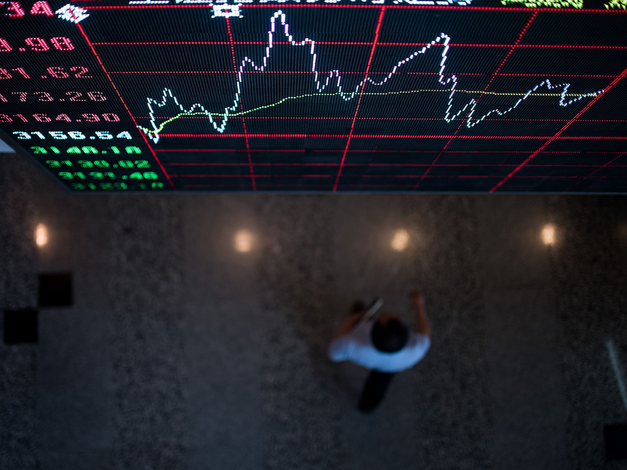 A board shows the stock movements inside the Shanghai Stock Exchange. (Photographer: Johannes Eisele/AFP/Getty Images)