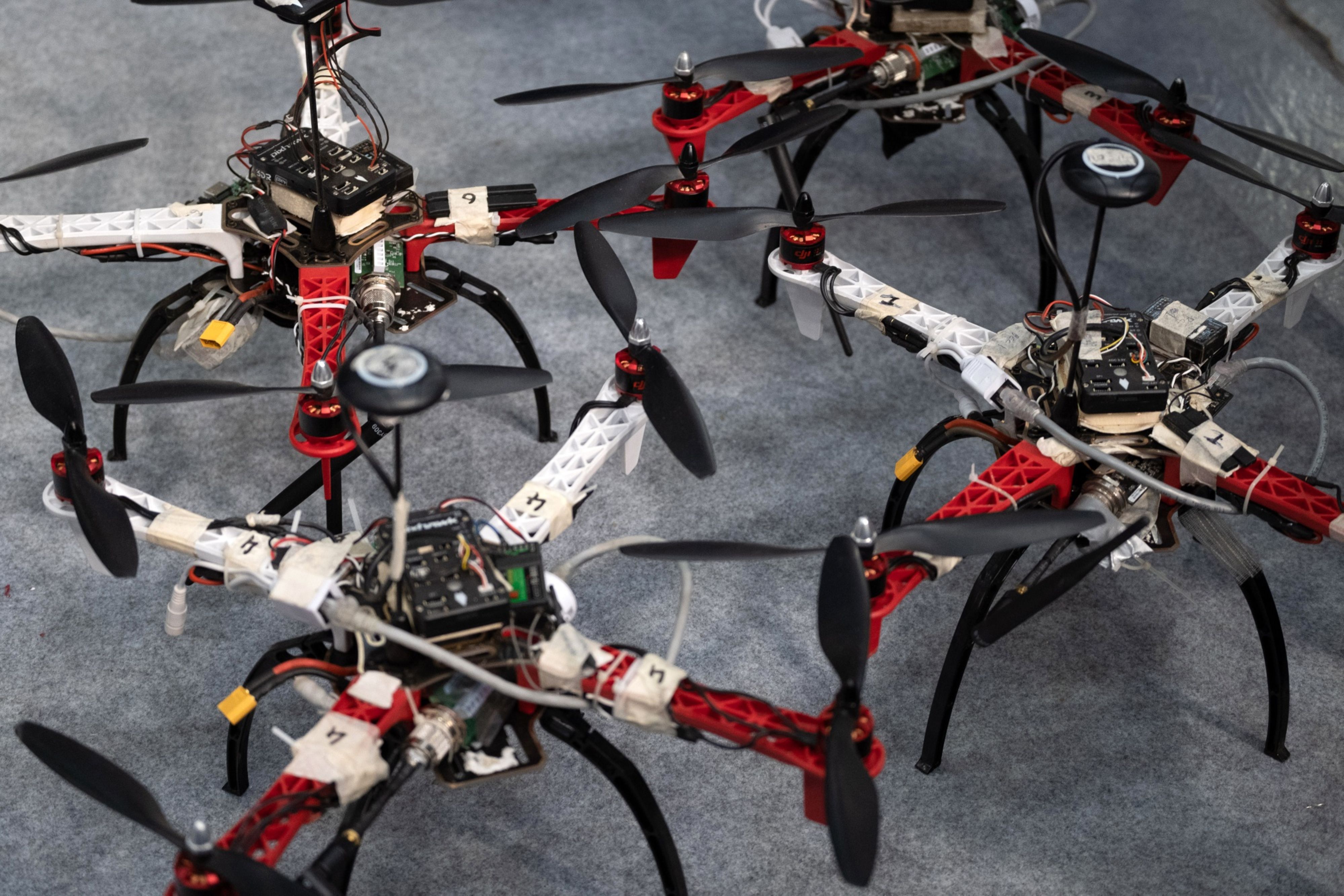 Drones sit on display. (Photographer: Karen Dias/Bloomberg)