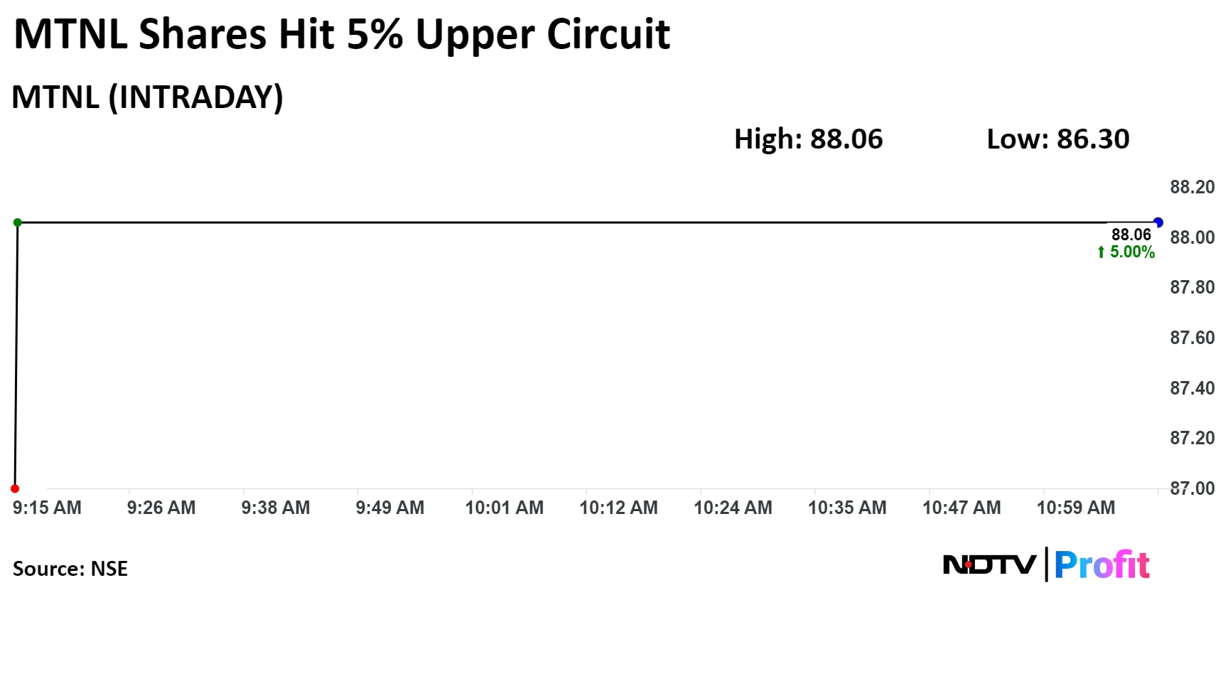 Shares of Mahanagar Telephone Nigam Ltd. hit 5% upper circuit on Wednesday, continuing its rally for the ninth straight session after the government allocated funds for bond payment.