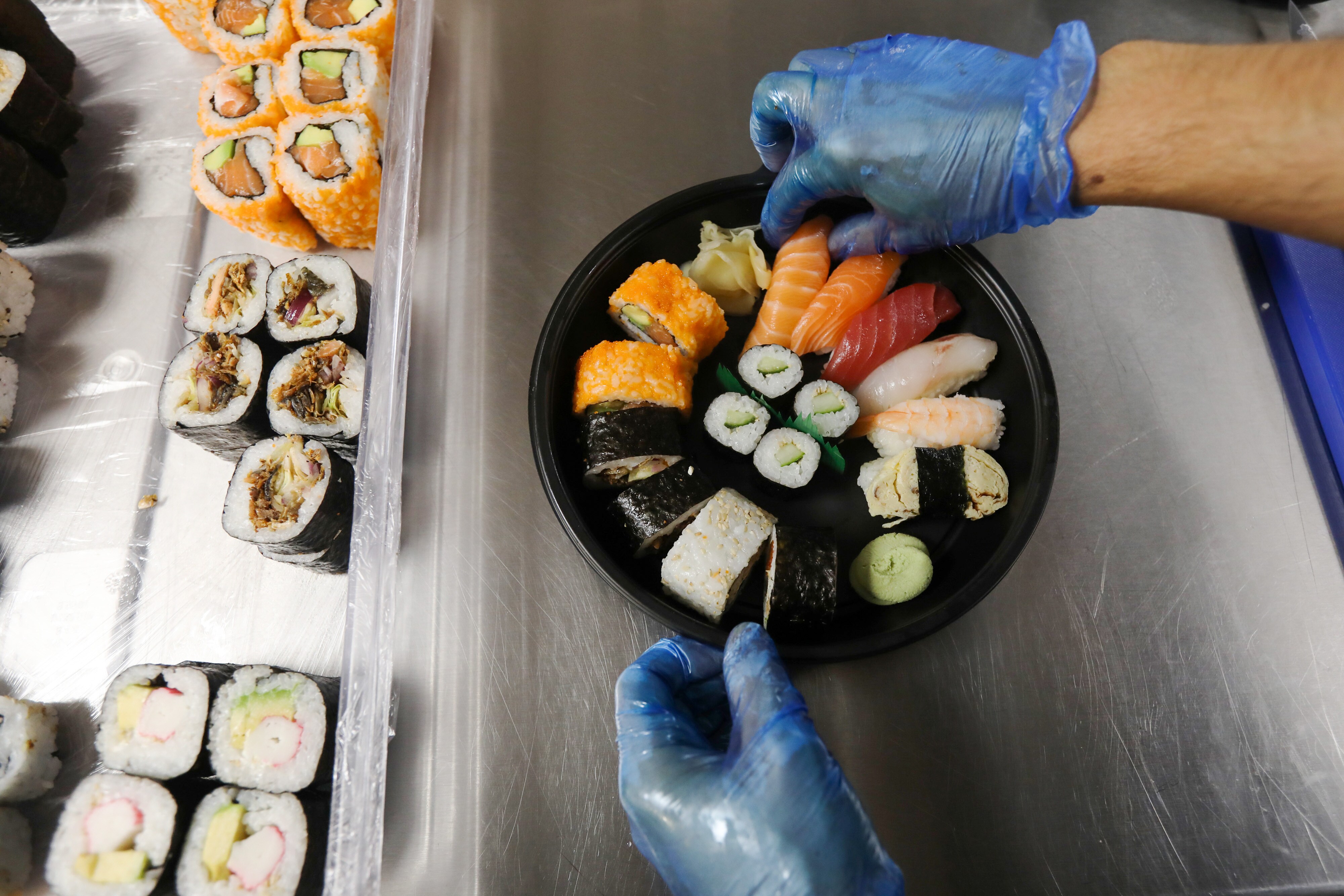 A chef with Moshimo Japanese restaurant delivery-only kitchen, prepares a sushi platter at a Deliveroo Editions field kitchen, operated by Roofoods Ltd., in Hove, U.K. (Photographer: Luke MacGregor/Bloomberg)