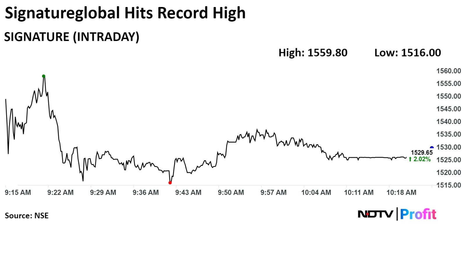 Shares of Signatureglobal rose as much as 4.04% to Rs 1,559.80 apiece on the NSE. It was trading 1.78% higher at Rs 1,525.90 apiece, compared to a 0.10% decline in the benchmark NSE Nifty 50 as of 10:17 a.m.