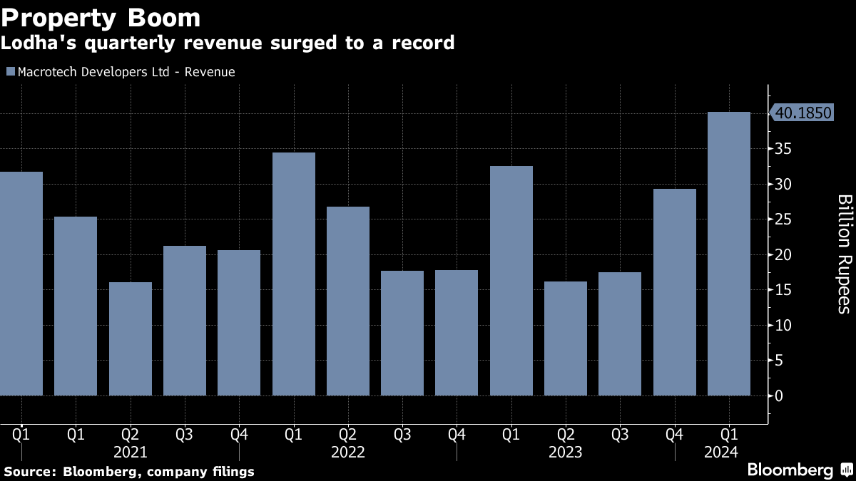 (Bloomberg) -- Macrotech Developers Ltd., a real estate firm that operates under the brand name Lodha, expects pre-sales to grow about 20% in the year to March after reporting its highest ever quarterly revenue.
