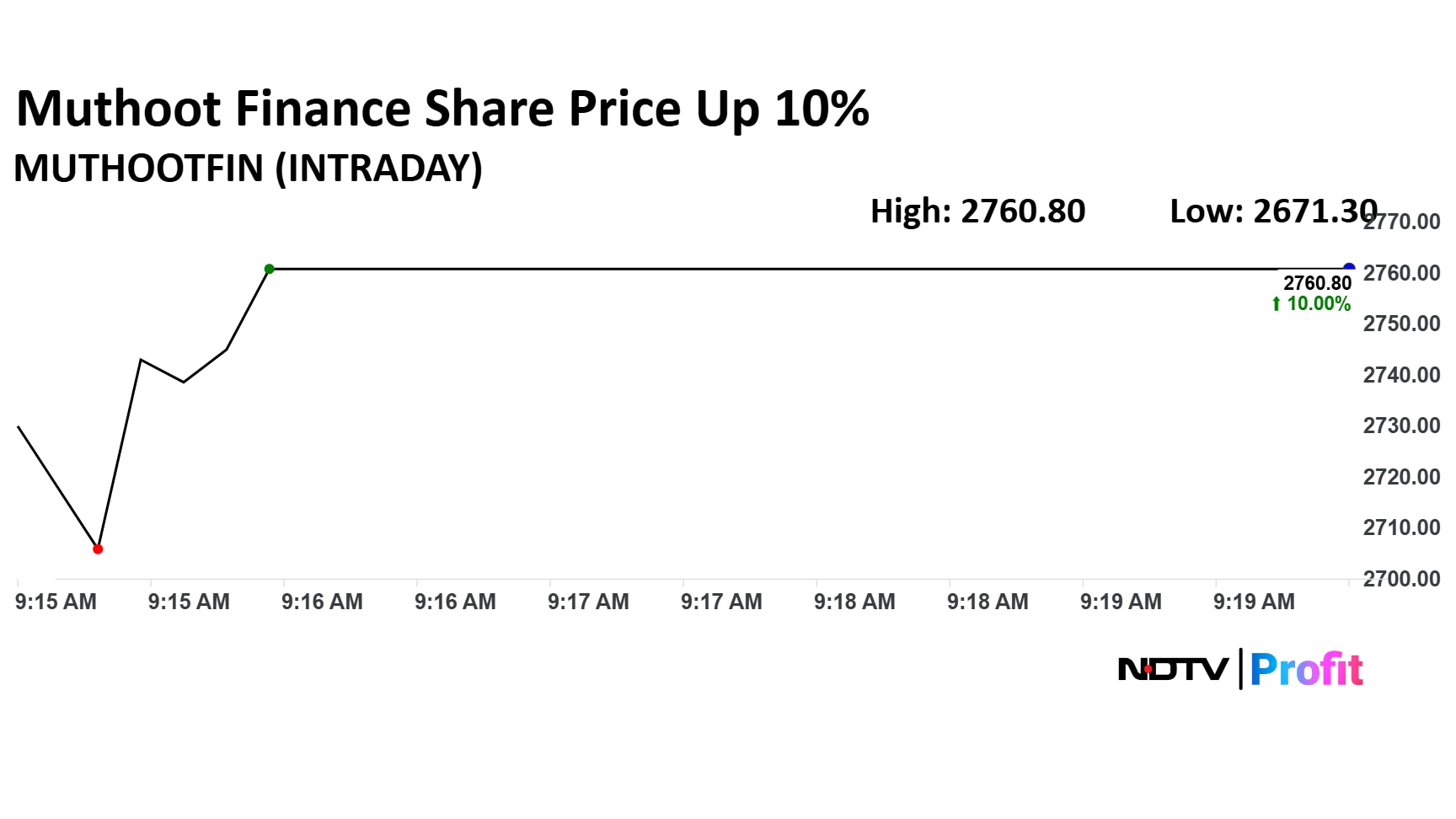Muthoot Finance stock rose as much as 10% to Rs 2,760 apiece on the NSE before it was locked in the upper circuit. The 10% gains compared to a 0.06% advance in the benchmark Nifty 50 as of 9:30 a.m.