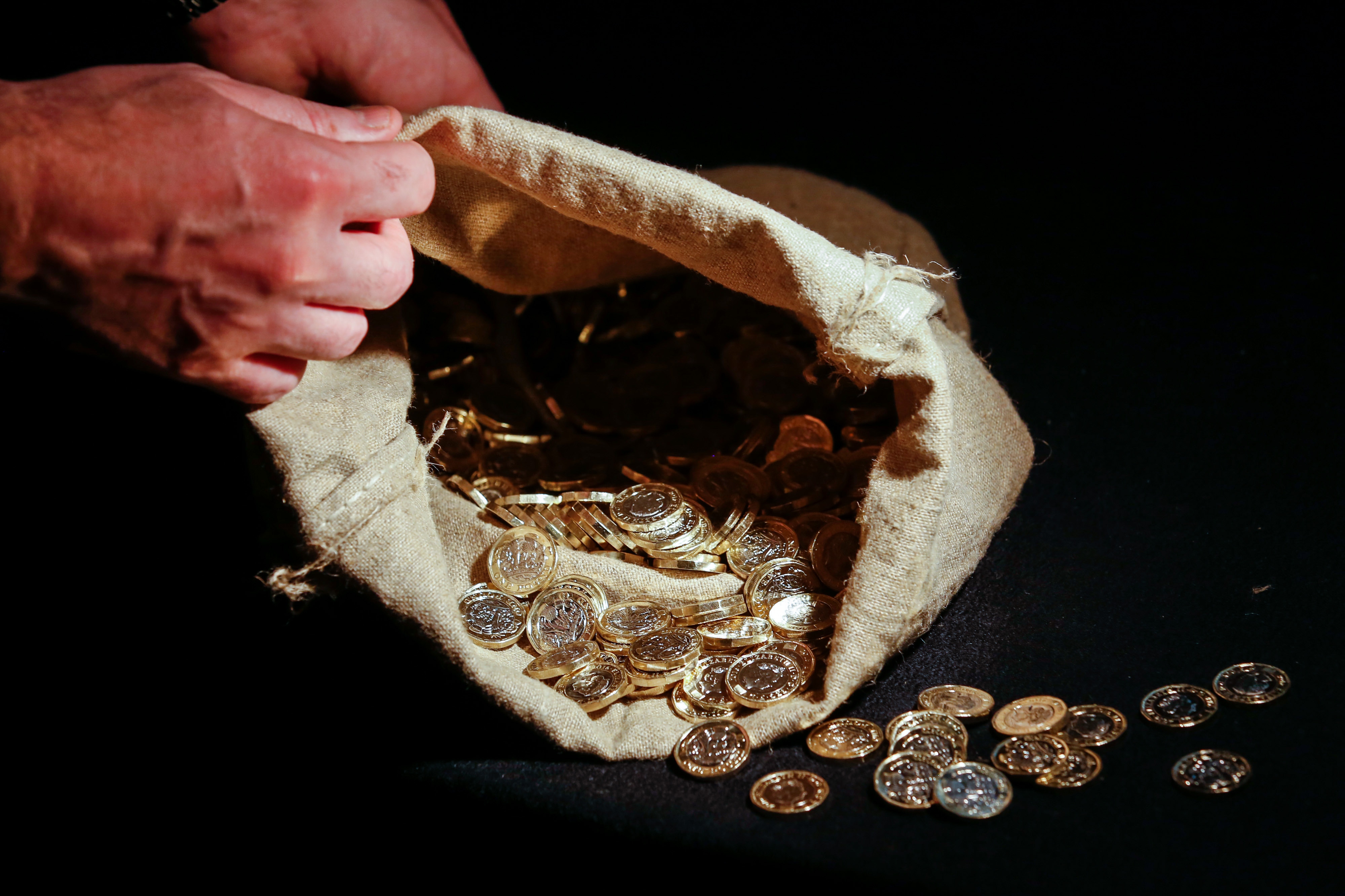 An employee of The Royal Mint Ltd. holds open a bag of new 12 sided 1 pound coins. (Photographer: Luke MacGregor/Bloomberg)