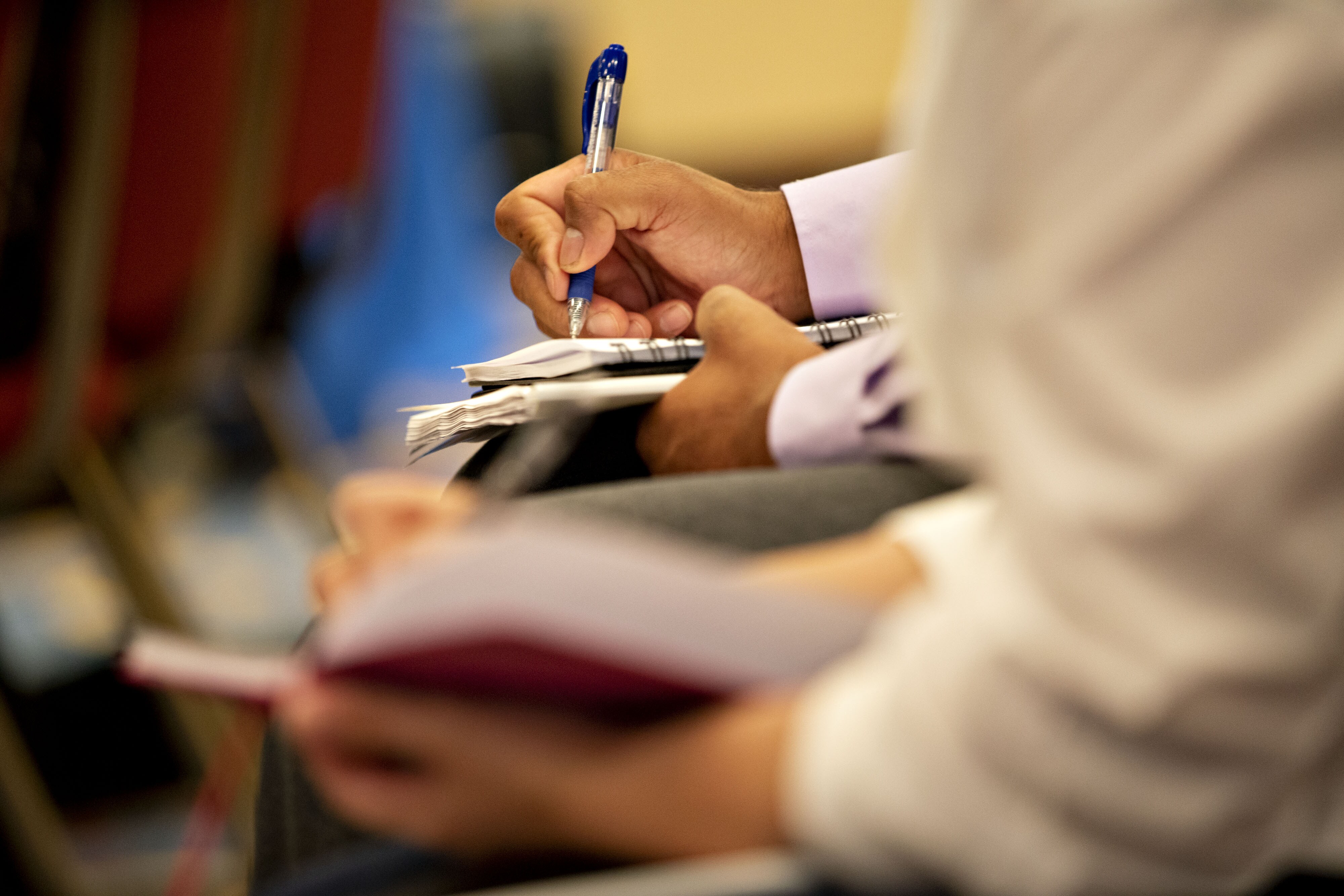 A job seeker takes notes during employer presentations. (Photographer: Daniel Acker/Bloomberg)