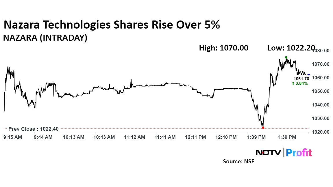 The shares of Nazara Technologies rose as much as 5.14% to Rs 1,075 apiece, the highest level since Jan. 10. It pared gains to trade 4.04% higher at Rs 1,063.75 apiece, as of 2:05 p.m. This compares to a 0.62% advance in the NSE Nifty 50 index.