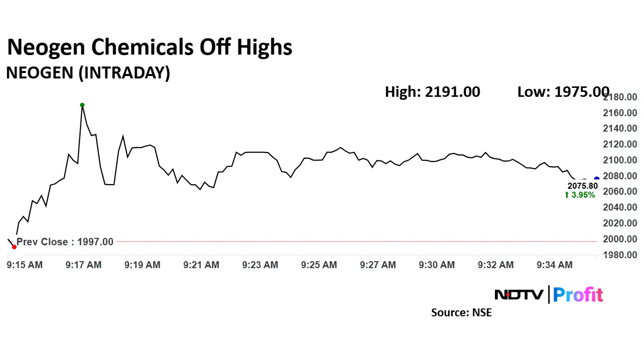 Neogen Chemicals share price rose 9.71% to Rs 2,191.00 apiece, the highest level since Jan 10. It, however, pared gains to trade 5.16% higher at Rs 2,100 apiece as of 9:32 a.m., as compared to 0.63% decline in the NSE Nifty 50 index.