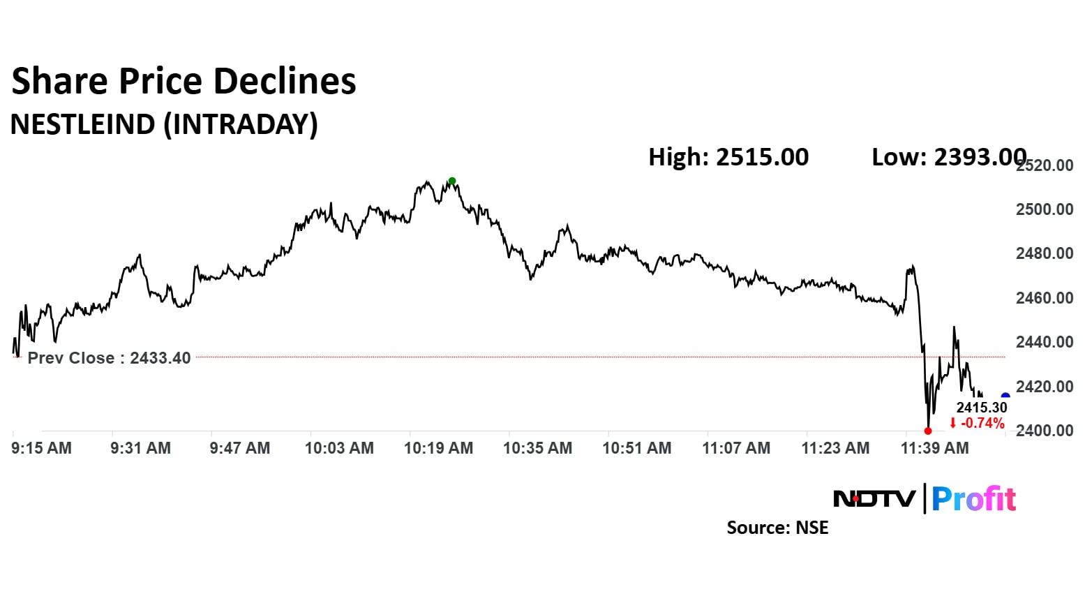 Shares of Nestle India fell as much as 1.15% to Rs 2,405 shortly after the company released it fourth quarter results as of 11:53 a.m. This compares to a 0.26% decline in the NSE Nifty 50.