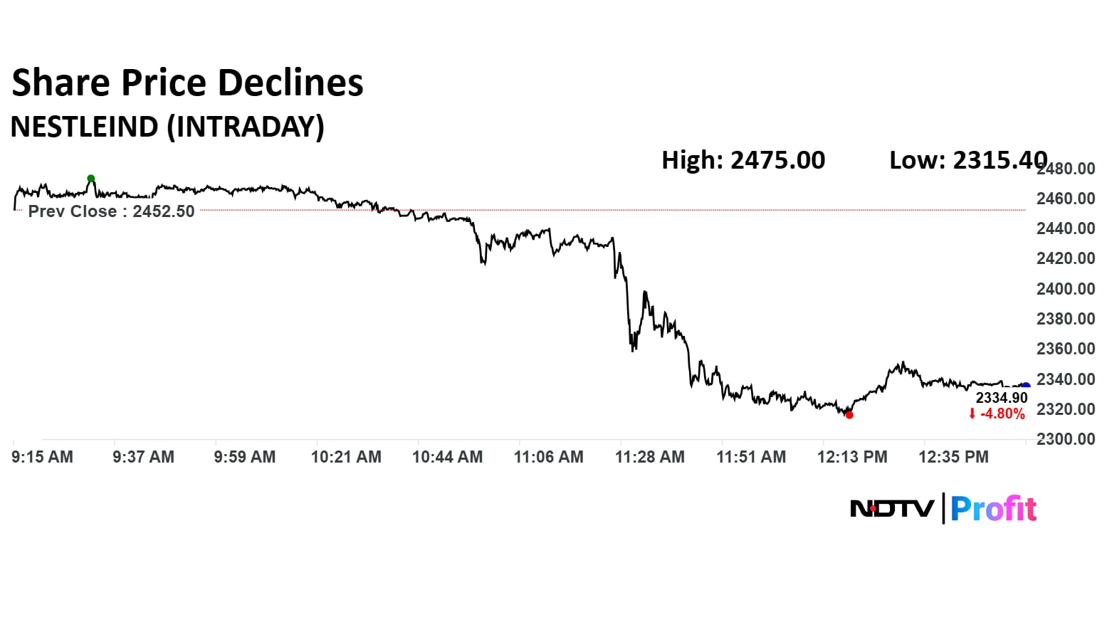 The scrip fell as much as 5.59% to Rs 2,315.40 apiece. It pared losses to trade 4.68% lower at Rs 2,33.70 apiece, as of 12:53 p.m. This compares to a 0.59% decline in the NSE Nifty 50 Index.