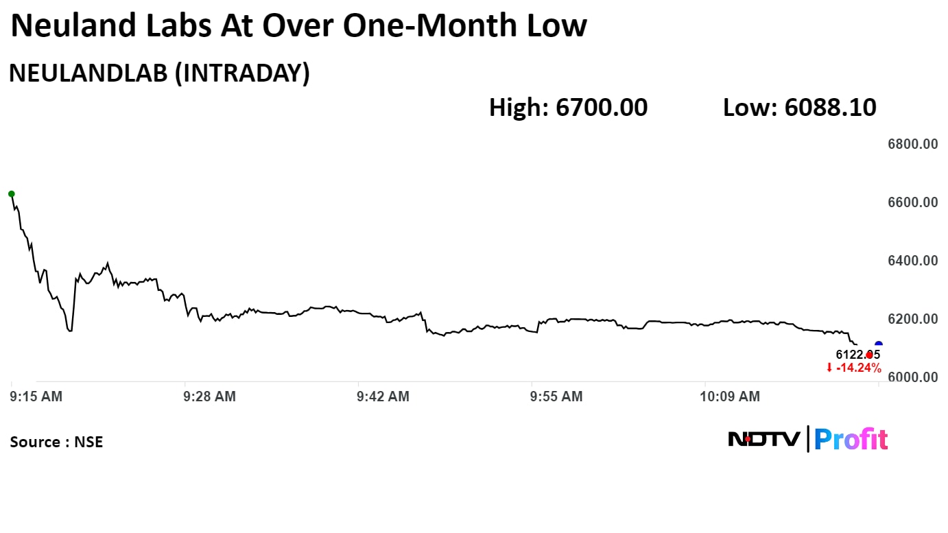 Shares of Neuland Laboratories fell 14.73% to Rs 6,088.10 apiece, touching the lowest level since April 9. It was trading 14.6% lower at Rs 6,124.50 as of 10:28 a.m., compared to 0.82% decline the NSE Nifty 50 index.