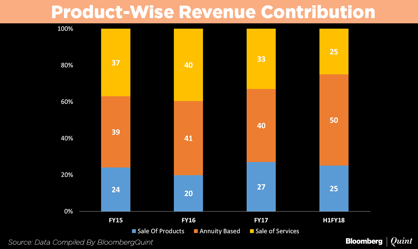 Client concentration is low with its top 5/10/20 accounts contributing 14/23/35 percent of revenues in the year to March. The company earns revenue from multiple streams, with annuity-based products contributing half the revenue.