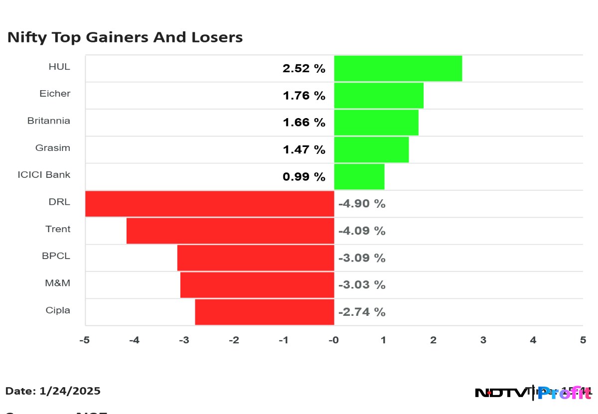 Share prices of Hindustan Unilever Ltd., Eicher Motors Ltd. and Britannia Industries Ltd. were the top gainers among the NSE Nifty 50 stocks on Friday. Among the losers were shares of Dr. Reddy's Laboratories Ltd., Trent Ltd. and Bharat Petroleum Corp.