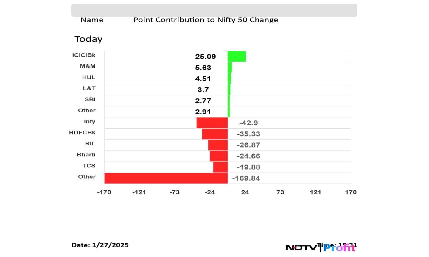 ICICI Bank, M&M, and Hindustan Unilever were the top gainers that cushioned the market. Shares of ICICI Bank rose over 1% on Monday after analysts increased their target price for the lender on better-than-expected earnings for the December quarter.