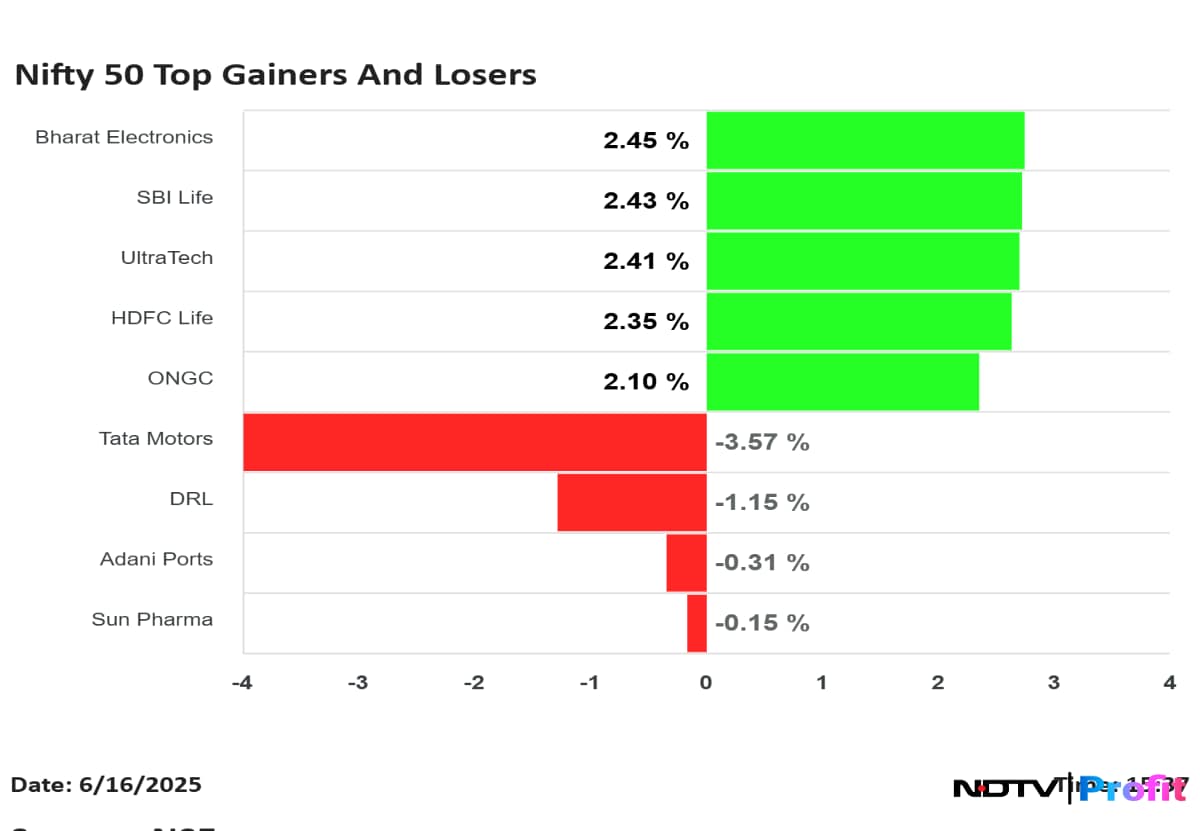 Bharat Electronics Ltd., SBI Life Insurance Co., UltraTech Cement Ltd., HDFC Life Insurance Co., and Oil & Natural Gas Corp. were among the top gainers on June 16.