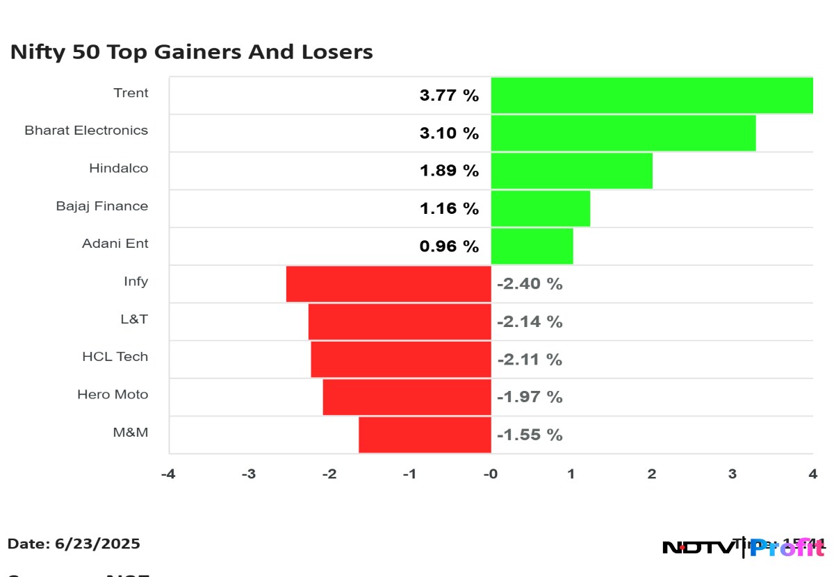 Trent topped the charts after gaining 3.77% to close at Rs 6,120 apiece; followed by Bharat Electronics closing 3.10% higher at Rs 420.90 apiece; and then Hindalco closing 1.89% higher at Rs 661.40 apiece. Bajaj Finance and Adani Enterprises were also among the winners.