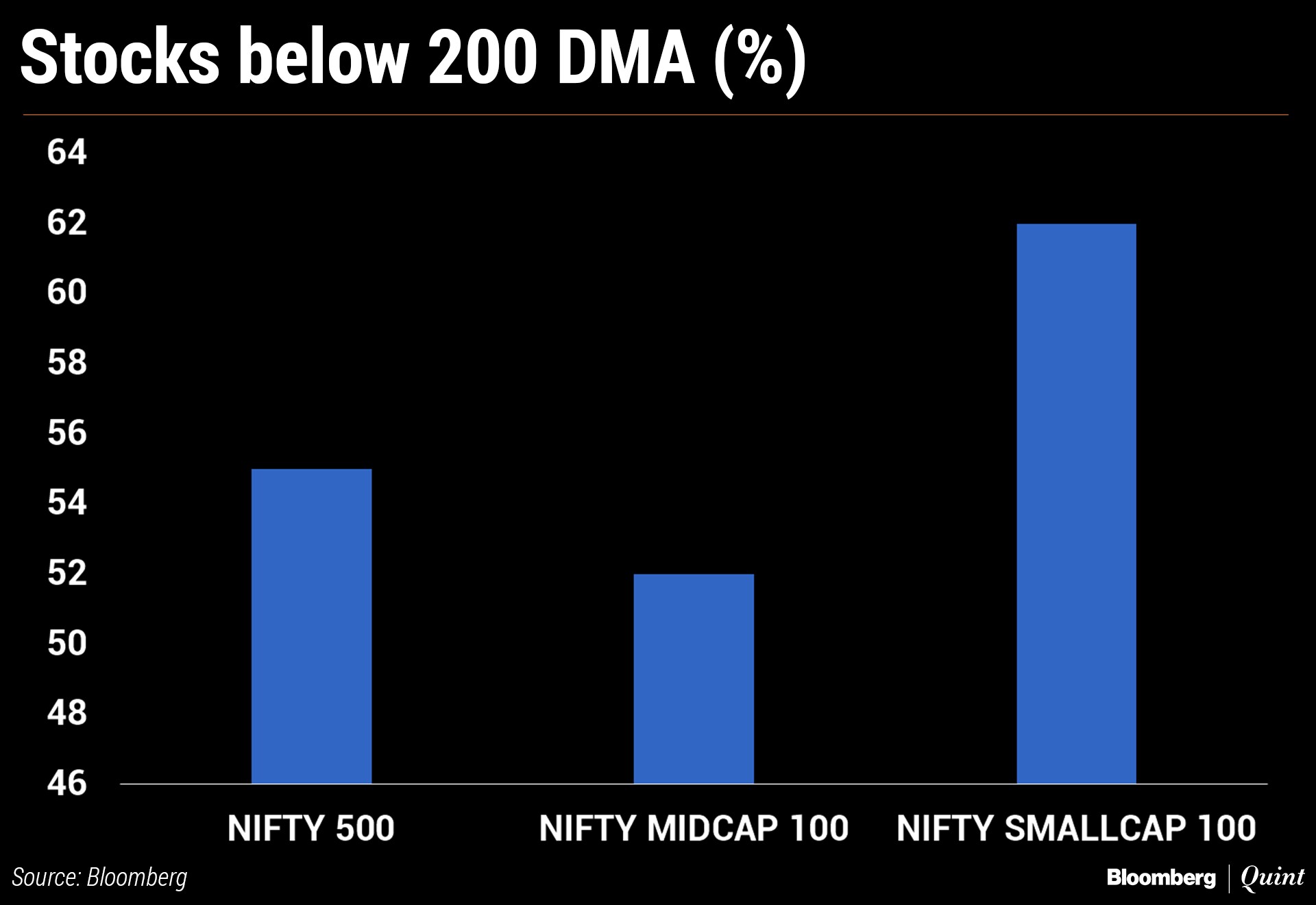 Of the 500 stocks, 279 are trading below the 200-day moving average—a key resistance level in technical analysis—reflecting a weakness in the broader market. Also, more than half of the constituents of the Nifty Midcap 100 Index and Nifty Smallcap 100 Index are trading below their 200-day moving average levels.