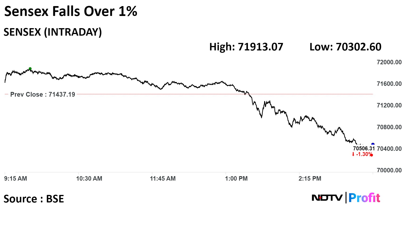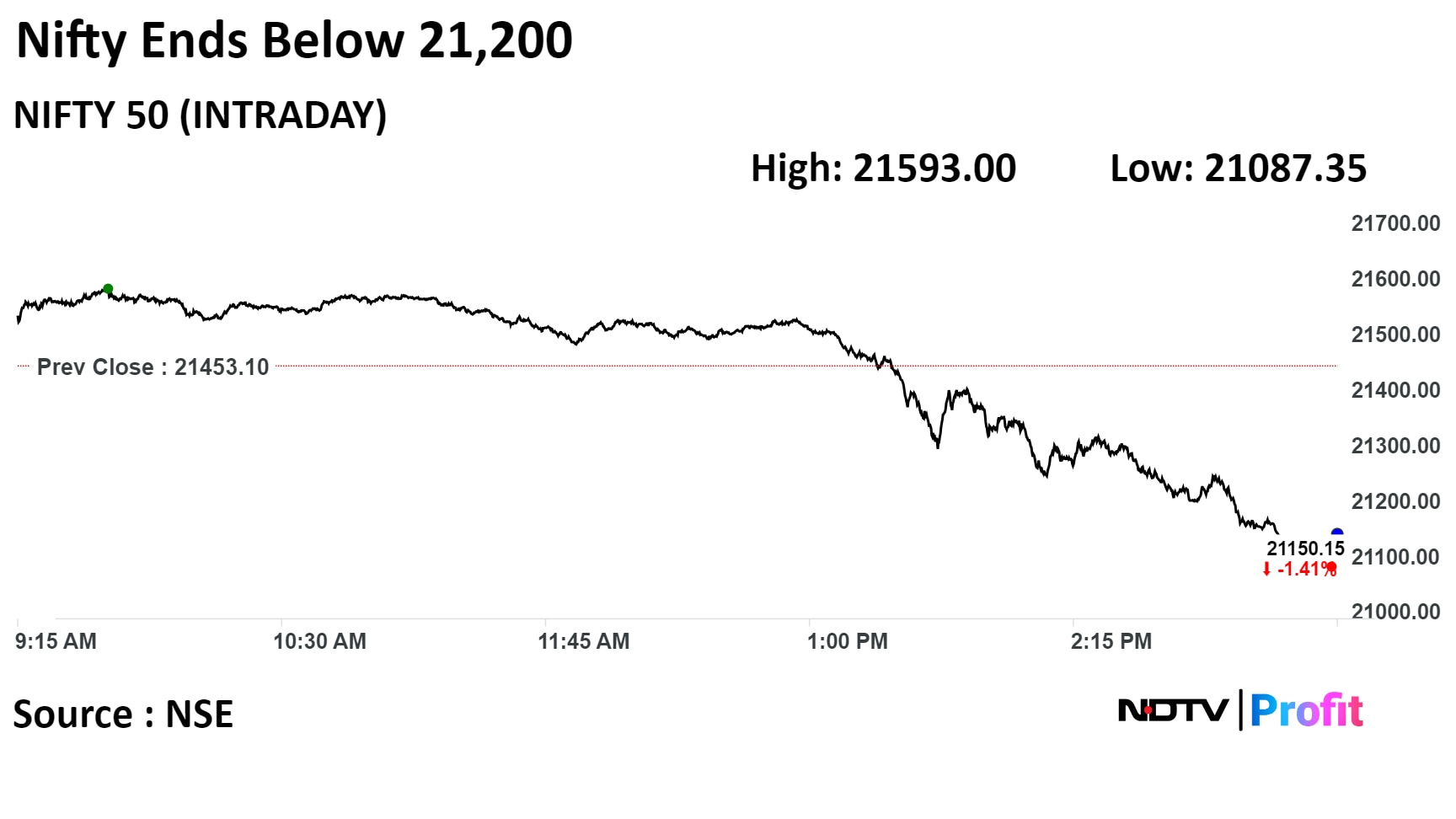 The Nifty 50 ended 302.95 points, or 1.41% lower at 21,150.15, while the Sensex ended 930.88 points, or 1.3% lower--the most since Oct. 26--at 70,506.31. Intraday, the Nifty hit a low of 21,087.35 and the Sensex fell to 70,302.60. The declines were broad-based, with all sectoral indices ending lower.