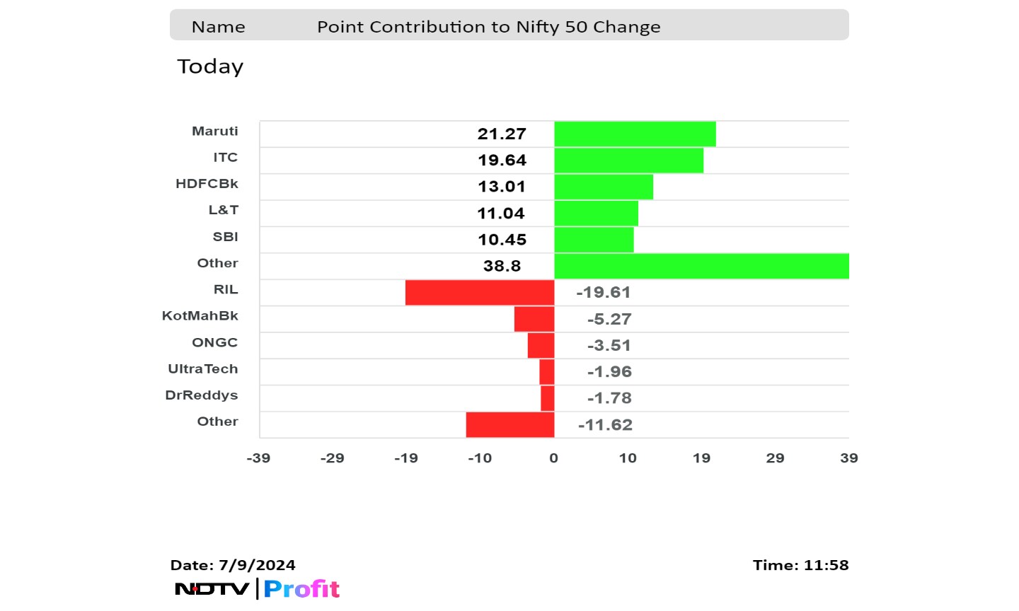 Shares of Maruti Suzuki India Ltd., ITC Ltd., HDFC Bank Ltd., Larsen & Toubro Ltd., and State Bank Of India were contributing the most to the Nifty.