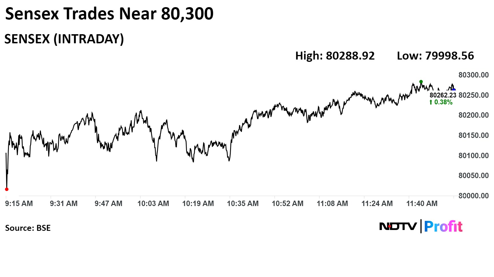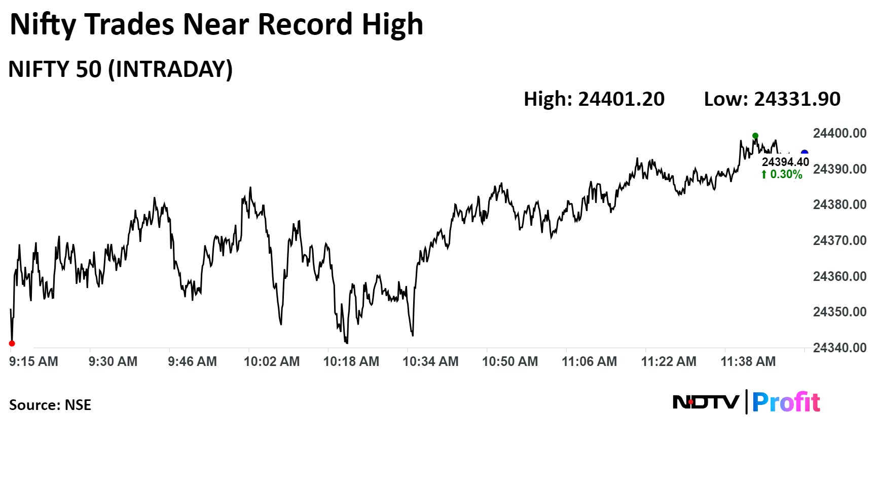 At 12:01 p.m., the NSE Nifty 50 traded at 24,390.65, up 0.29% or 70.10 points after hitting record high of 24,404.00. The S&P BSE Sensex gained 0.36% or 287.38 points to trade at 80247.81.