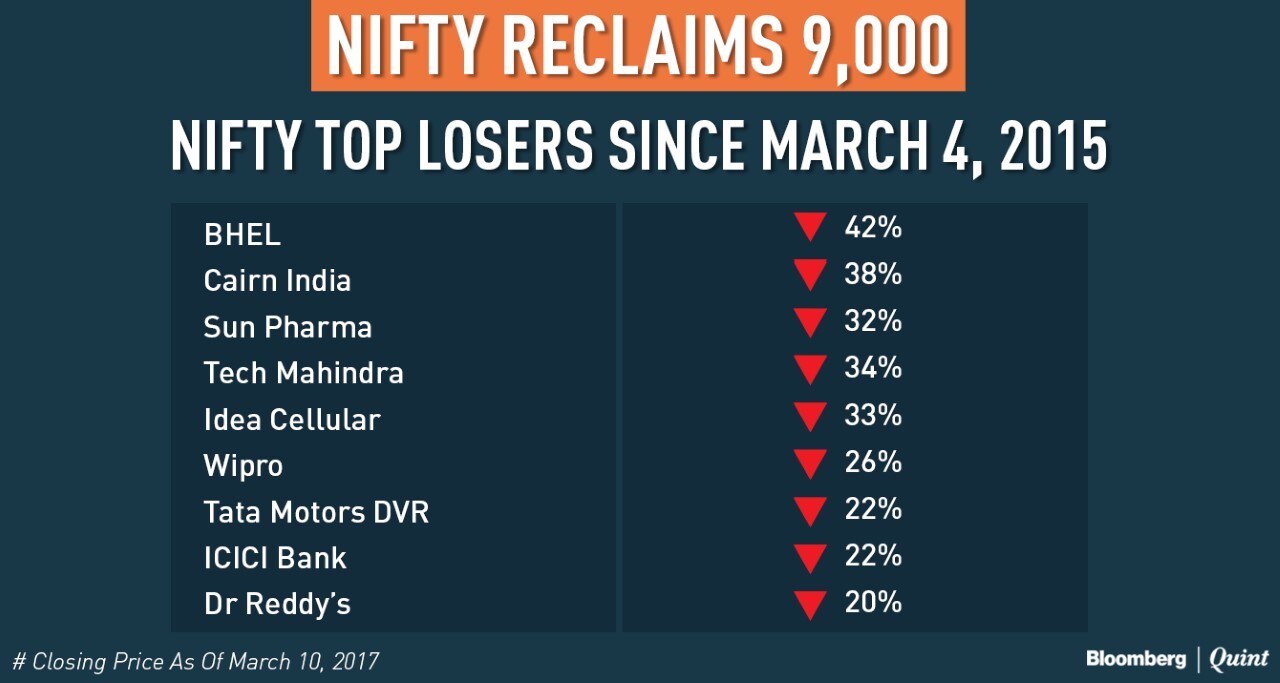 The stocks that weighed down the Nifty 50 index include Bharat Heavy Electricals Ltd. (BHEL), Tech Mahindra Ltd., Idea Cellular Ltd. and Sun Pharmaceuticals Ltd., each of which lost between 32 and 34 percent.