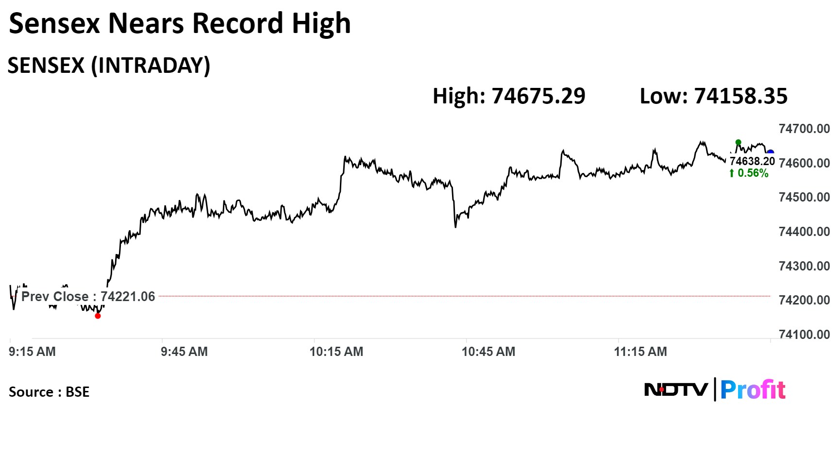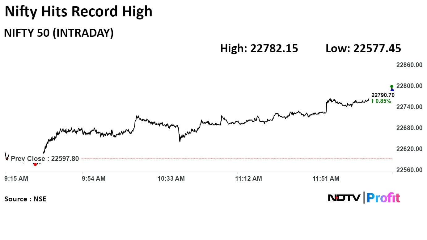 At 12:32 p.m., the NSE Nifty 50 was trading 192.00 points, or 0.85%, higher at 22,789.80 after hitting its lifetime high of 22,806.20, and the S&P BSE Sensex gained 598.78 points, or 0.81%, to trade at 74,819.84.