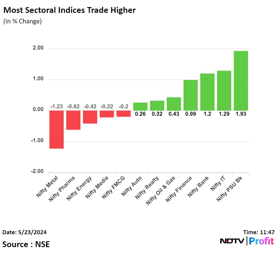 Most sectoral indices were higher on NSE, with Nifty PSU Bank, Nifty IT, and Nifty Bank gaining more than 1%.