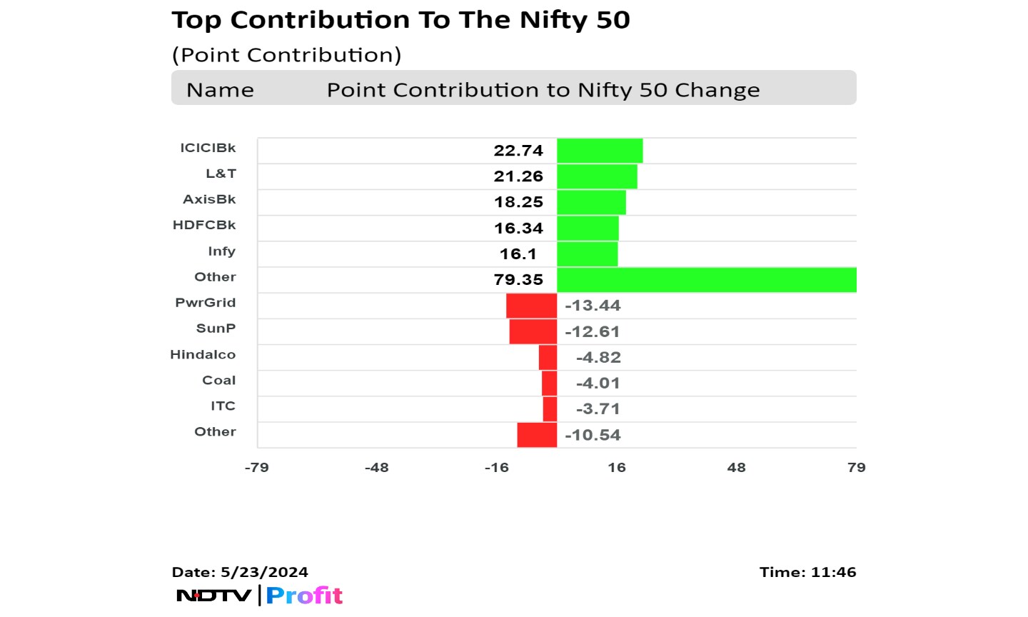 Shares of ICICI Bank Ltd., Larsen & Toubro Ltd., Axis Bank Ltd., HDFC Bank Ltd., and Infosys Ltd. contributed the most to gains in the Nifty.