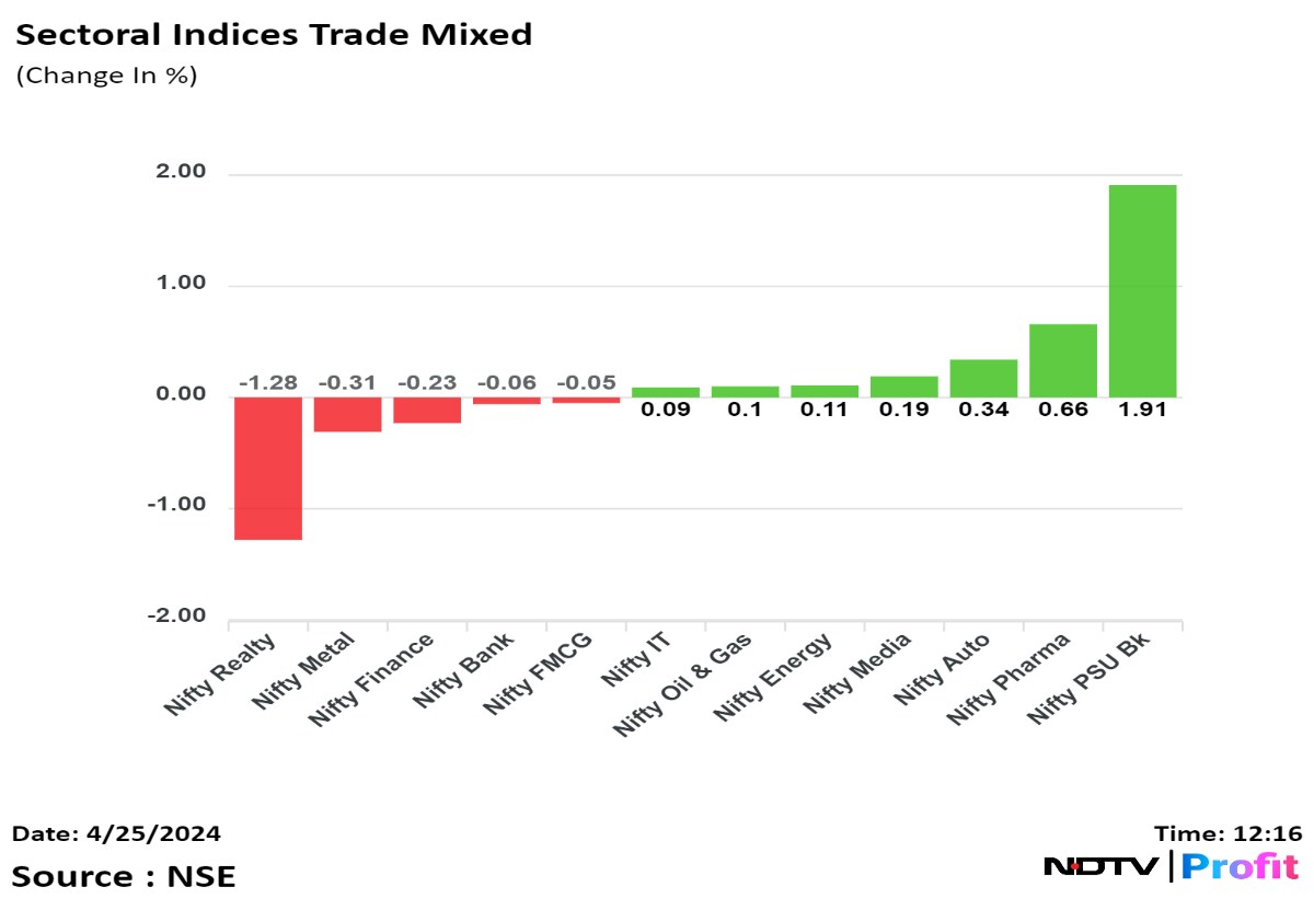 On NSE, out of 12 sectors, seven sectors advanced and five declined. The NSE Nifty PSU Bank index rose the most, while the NSE Nifty Realty index declined the most.