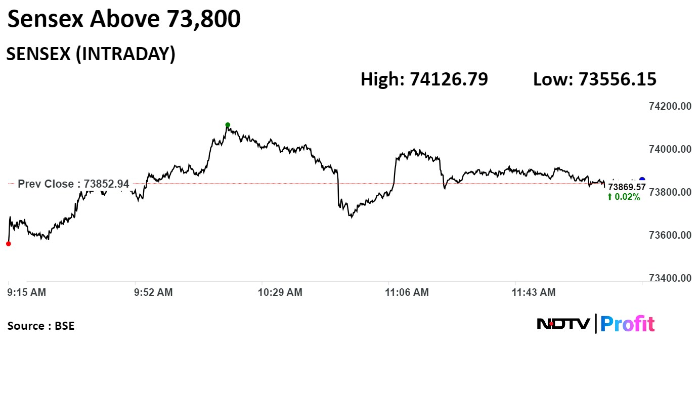 At 12:21 p.m., the NSE Nifty 50 was trading 0.45 points or 0.01% lower at 22,401.95, and the S&P BSE Sensex was trading 15.62 points or 0.021% lower at 73,837.32.