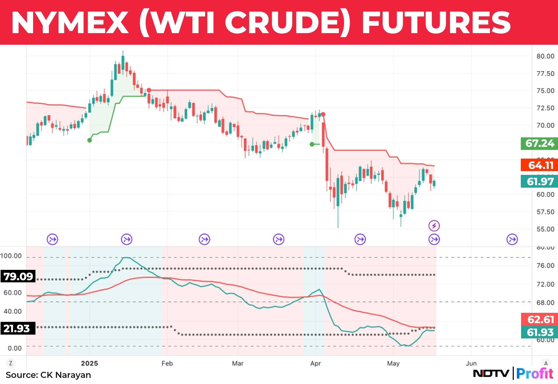 It is caught in a maze of Gann angles, and the momentum too is fizzling out near 4.4%. The odds that it would make it to 4.6% or break below 4.38 appear to be equal. So, it is wait-and-watch time for now. We may therefore focus on our own news for a while, and this could mean stock-specific action for the week ahead. The Dollar Index (DXY) is also struggling to get back on its feet after breaking below the 100 level a while ago. Indicators are oversold, but it may take effort to get the dollar back into a bull mode. So, nothing untoward may emerge from this area for now. Chart 5 is crude oil futures.