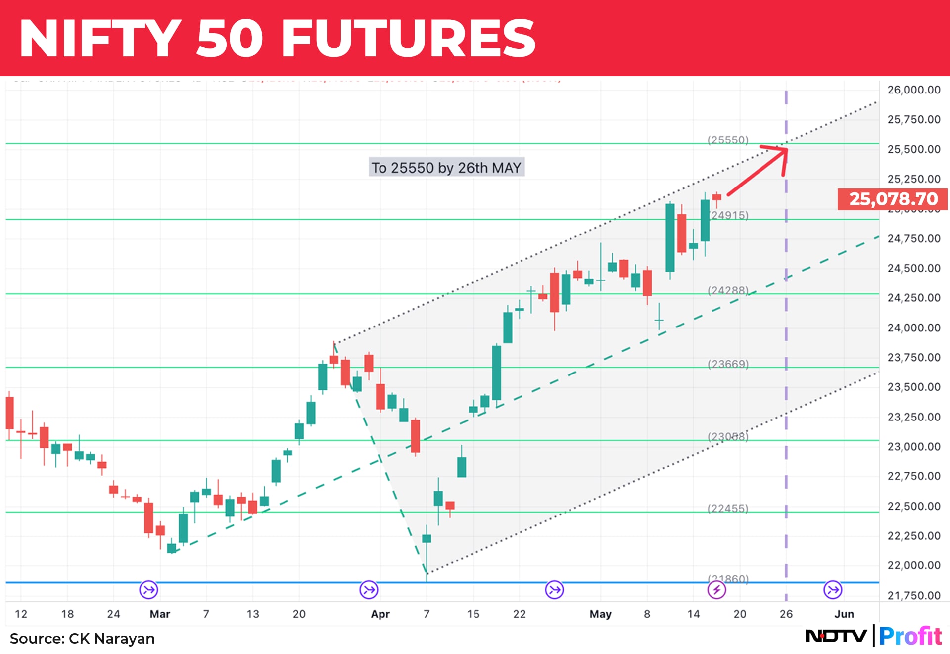 The top of the pitchfork channel is not too far away, please note. I give high importance to such resistances and therefore am not going to be carried away by any big bull talk. On the chart I have marked May 26 as the next upcoming turn date, and the coincidence of the price level channel and the time target is around 25,550. That is where I would be looking for an end to the present advance. It may undershoot but may not overshoot, is what I feel just now.