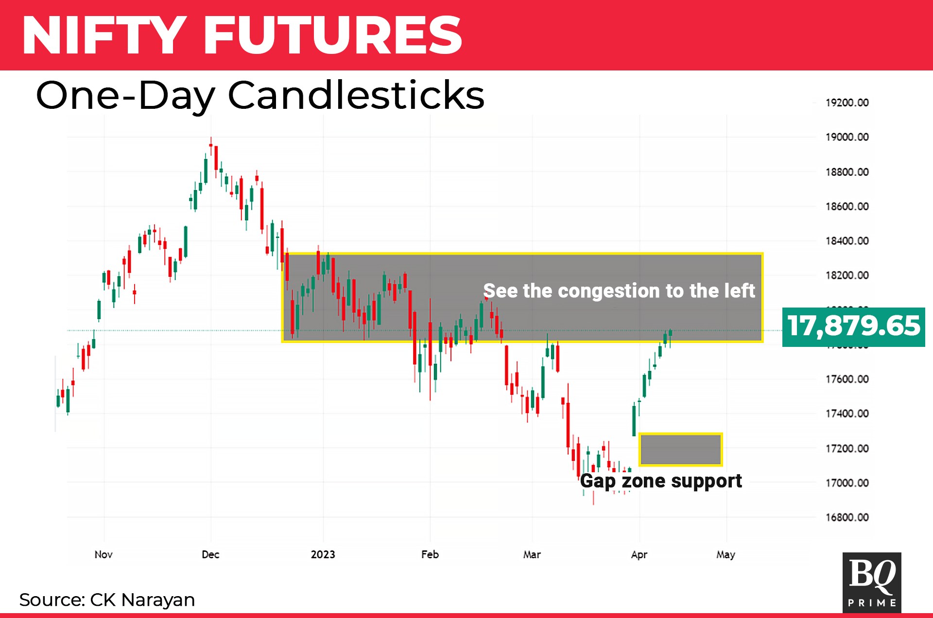 The difficulty here is setting stops on such positions. As can be seen on the chart, the only support area is marked by the smaller triangle, at the gap zone left on March 31. That is way down at 17,300 area.  So, maybe a good idea would be to book partially and hold only balance portion with a stop at 17,300. On the options front, the next expiry has large open interest created at the 18300 CE on Thursday. At a price of 2.00, it doesn't seem to me to be short calls. Ergo, they could be long call positions. So, there is a bunch out there, who believes that market may go higher! Maybe worth trying that trade next week. Else one of the trades I may want to make is a 1x2 ratio spread of 18,000-18,200 CE of monthly series that would cost me around 30-33 points. Not too big a deployment for playing for the continuation of the trade.