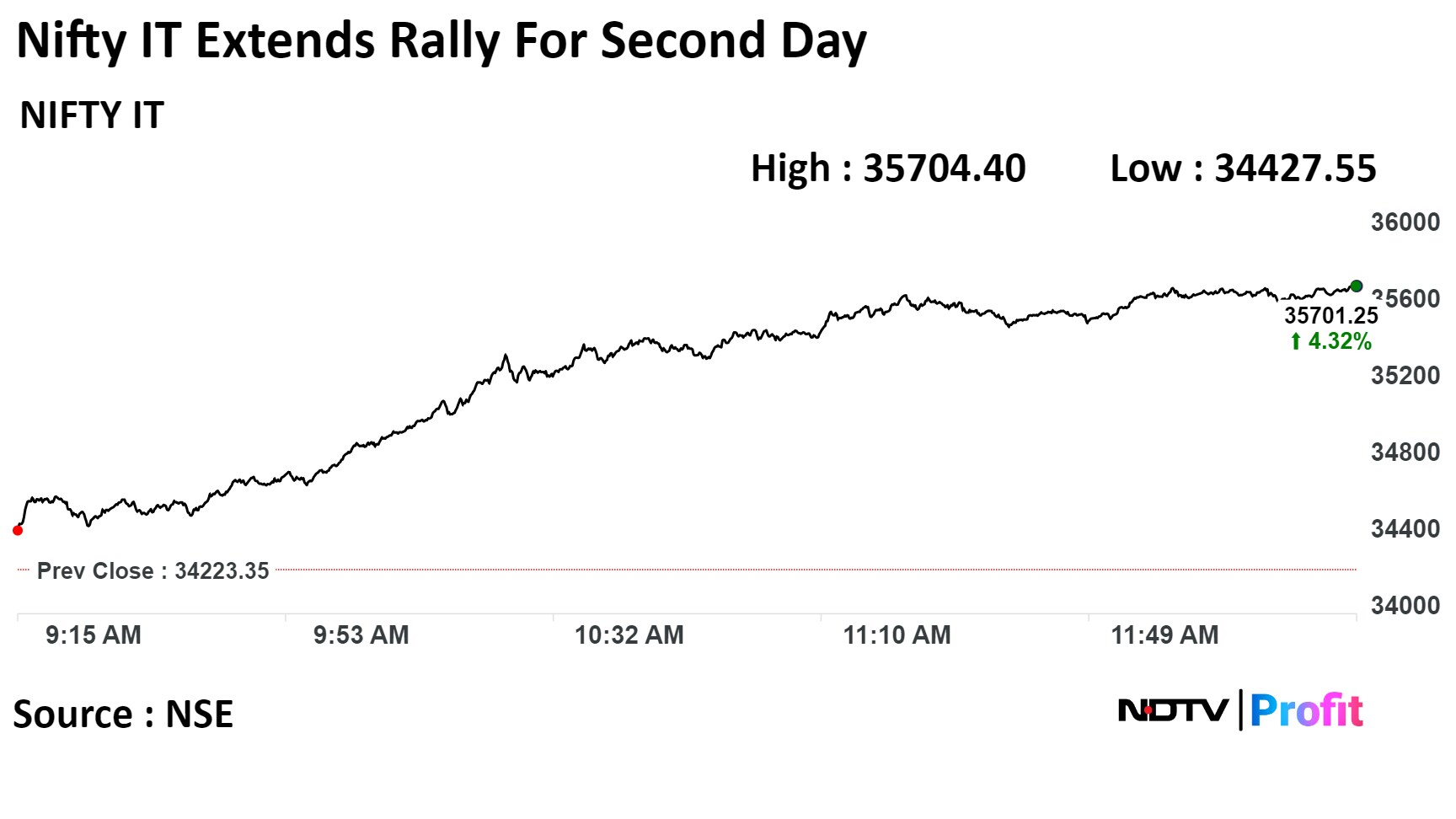 The Nifty IT rose as much as 4.33% to 35,704.40. It was trading 4.30% up at 35,694.85 as of 12:29 p.m.