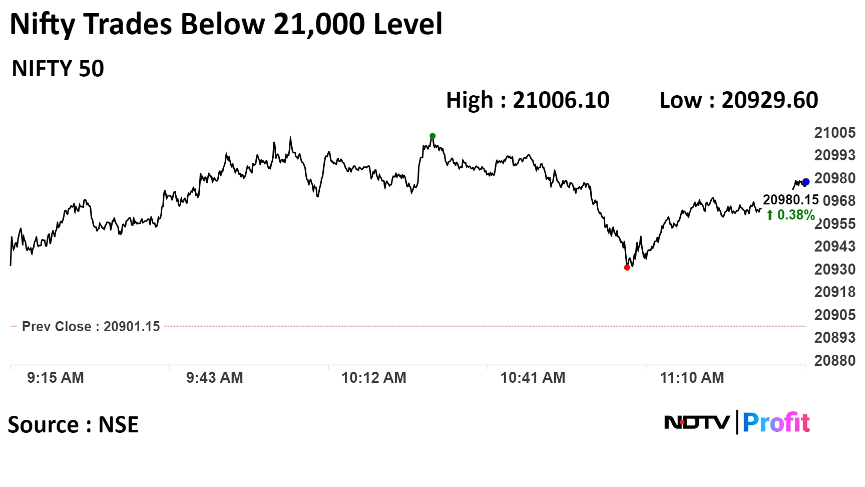 Benchmark indices were off their highs through midday after the Nifty 50 crossed the crucial 21,000 mark and Sensex hit its fresh lifetime high as shares of Bajaj Finance Ltd., ITC Ltd., Mahindra & Mahindra Ltd., and Adani Enterprises Ltd.