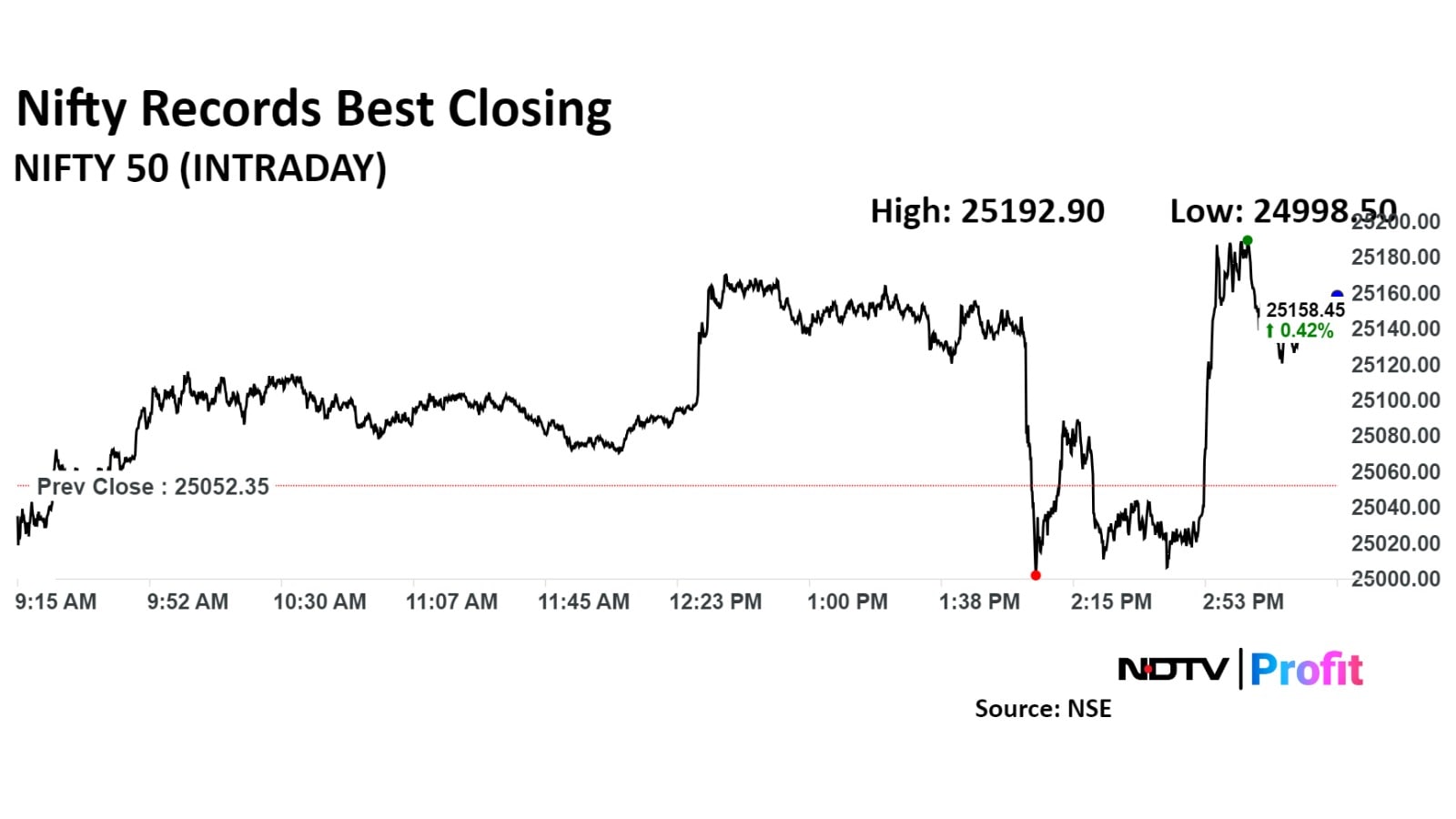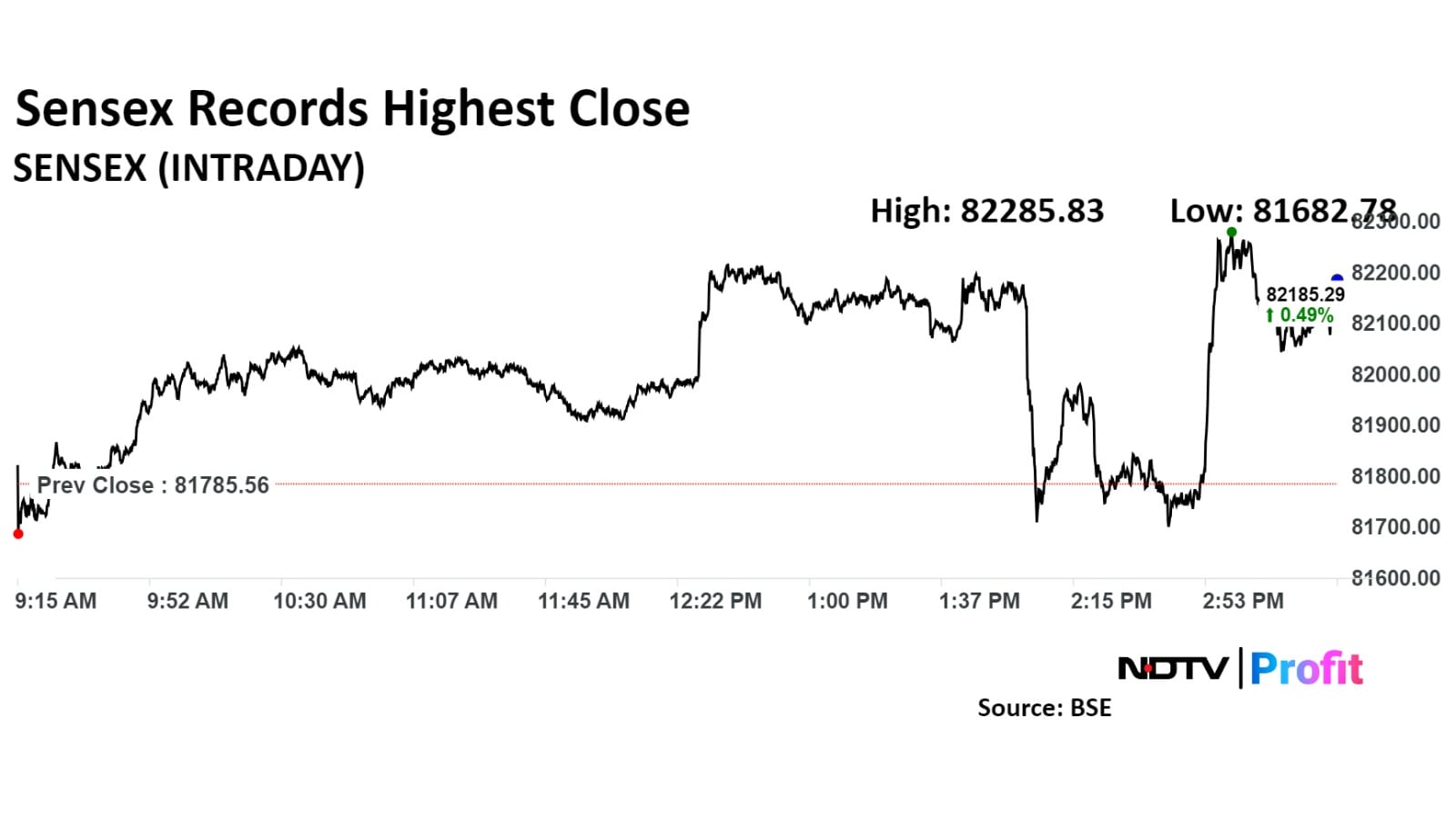 The NSE Nifty 50 settled 99.60 points, or 0.40%, higher at 25,151.95, and the BSE Sensex ended 349.05 points, or 0.43%, higher at 82,134.61. Intraday, the Nifty hit a fresh high of 25,192.90, and the Sensex rose to a lifetime high of 82,285.83.