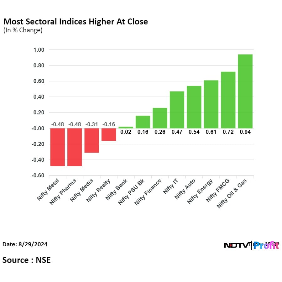 On NSE, seven sectors ended higher, four declined, and one ended flat. The NSE Nifty Oil & Gas rose the most, and the NSE Metal declined the most.