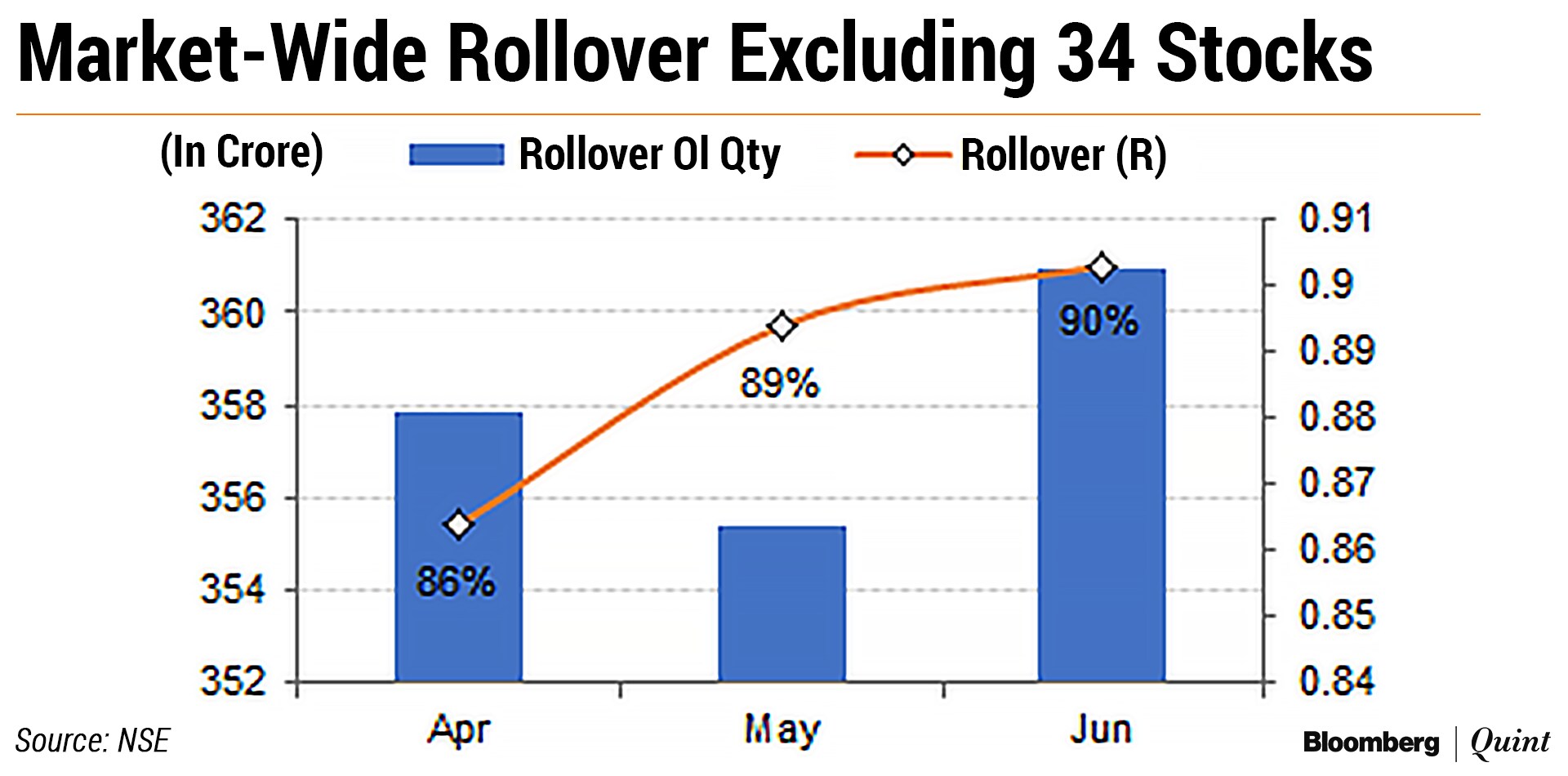 The market-wide rolls showed a steep drop mainly after 34 stocks were excluded from the futures and options trading. The rollovers were at 86 percent with an open interest of 361 crores shares against 90 percent in the previous series with an open interest of 431 crore shares.
