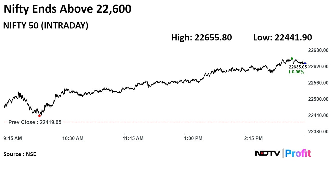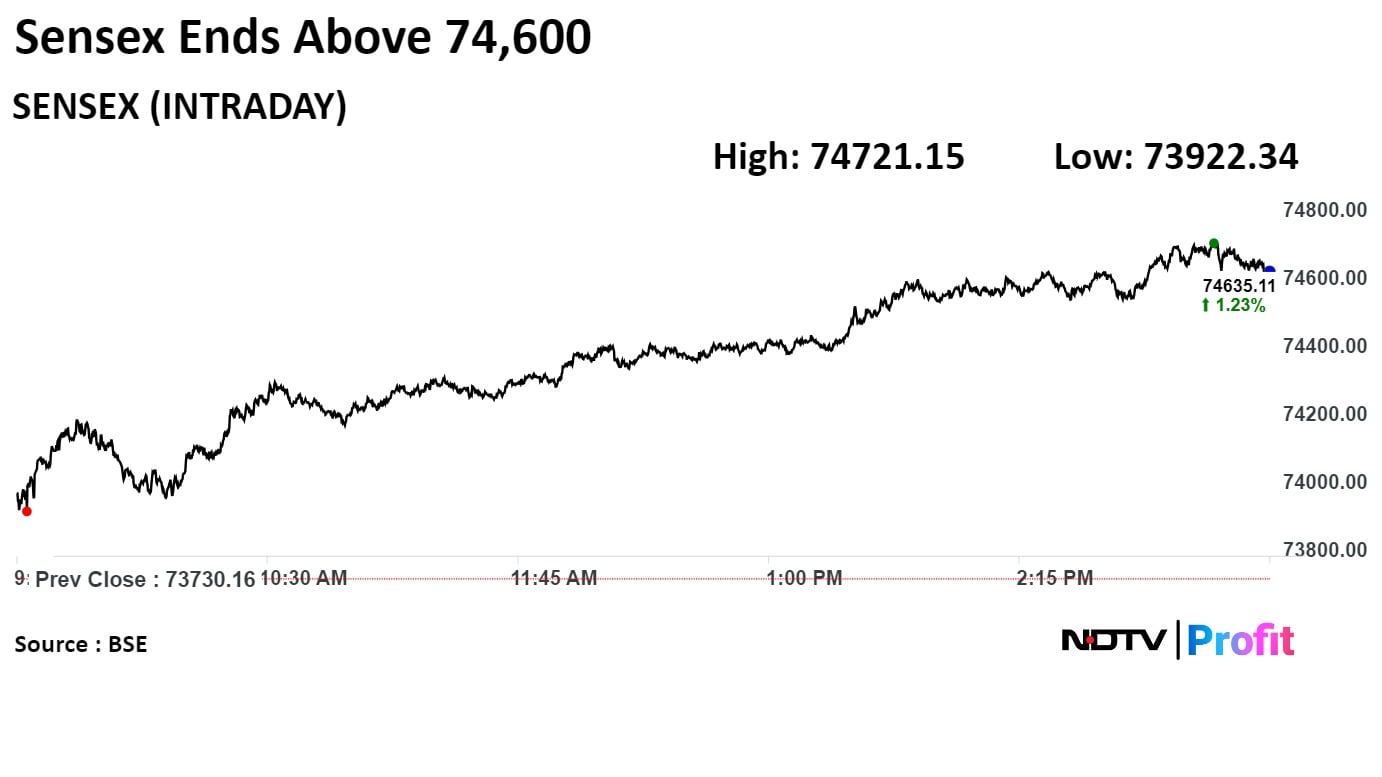 The Nifty settled 215.10 points, or 0.96%, higher at 22,635.05, and the Sensex rose 941.12 points, or 1.28%, to end at 74,671.28.