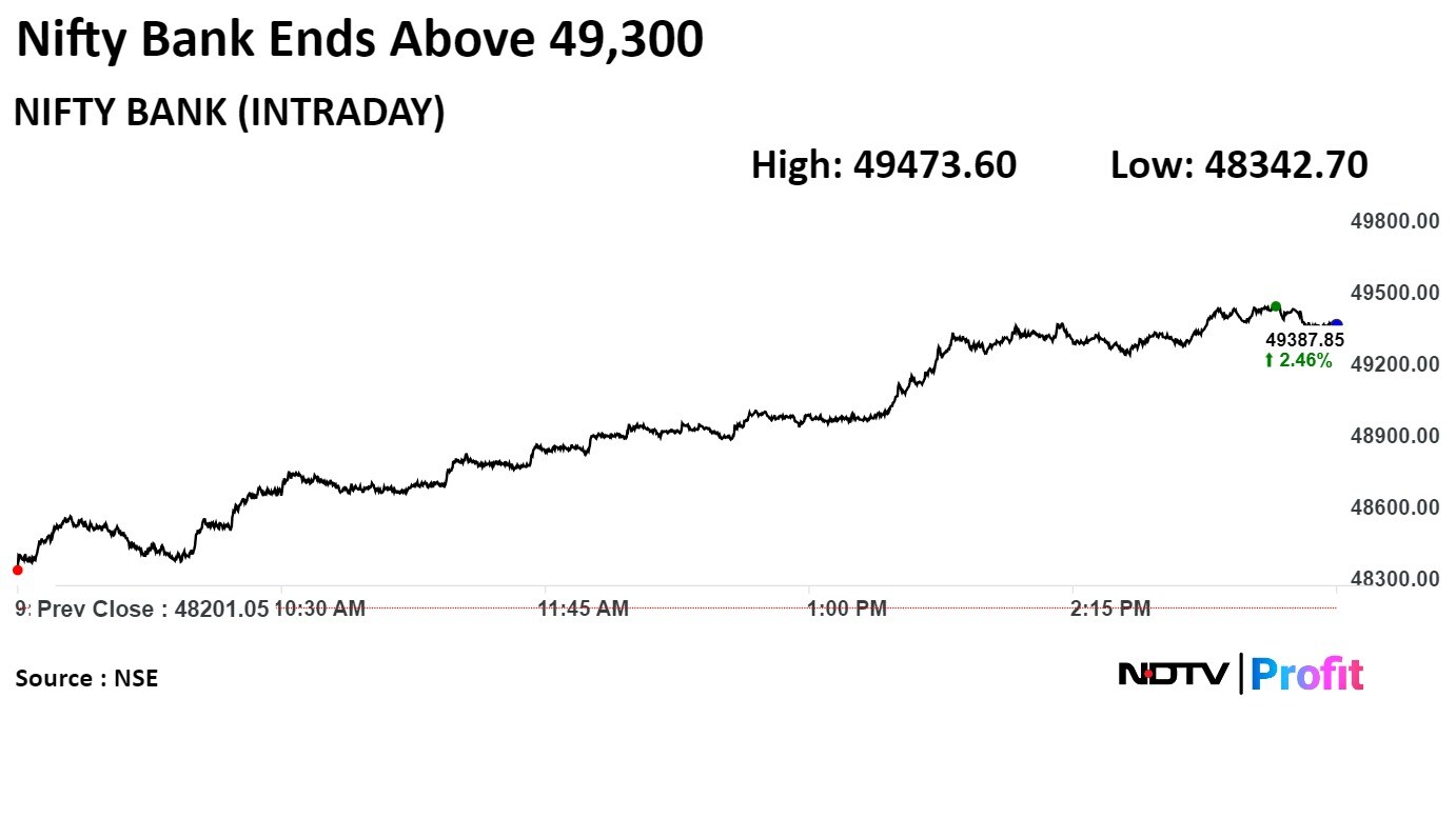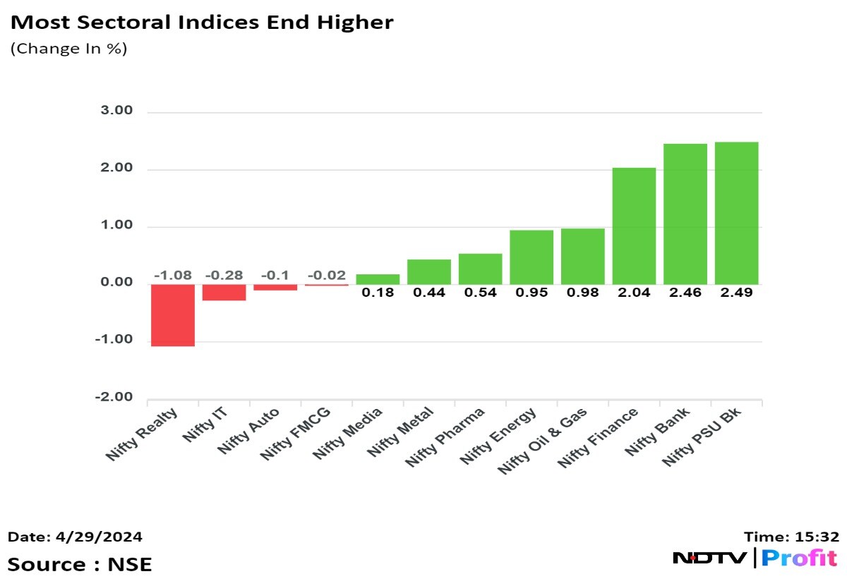 Most sectoral indices ended higher with Nifty PSU Bank, Nifty Bank and Nifty Finance gaining the most while Nifty Realty fell 1%.