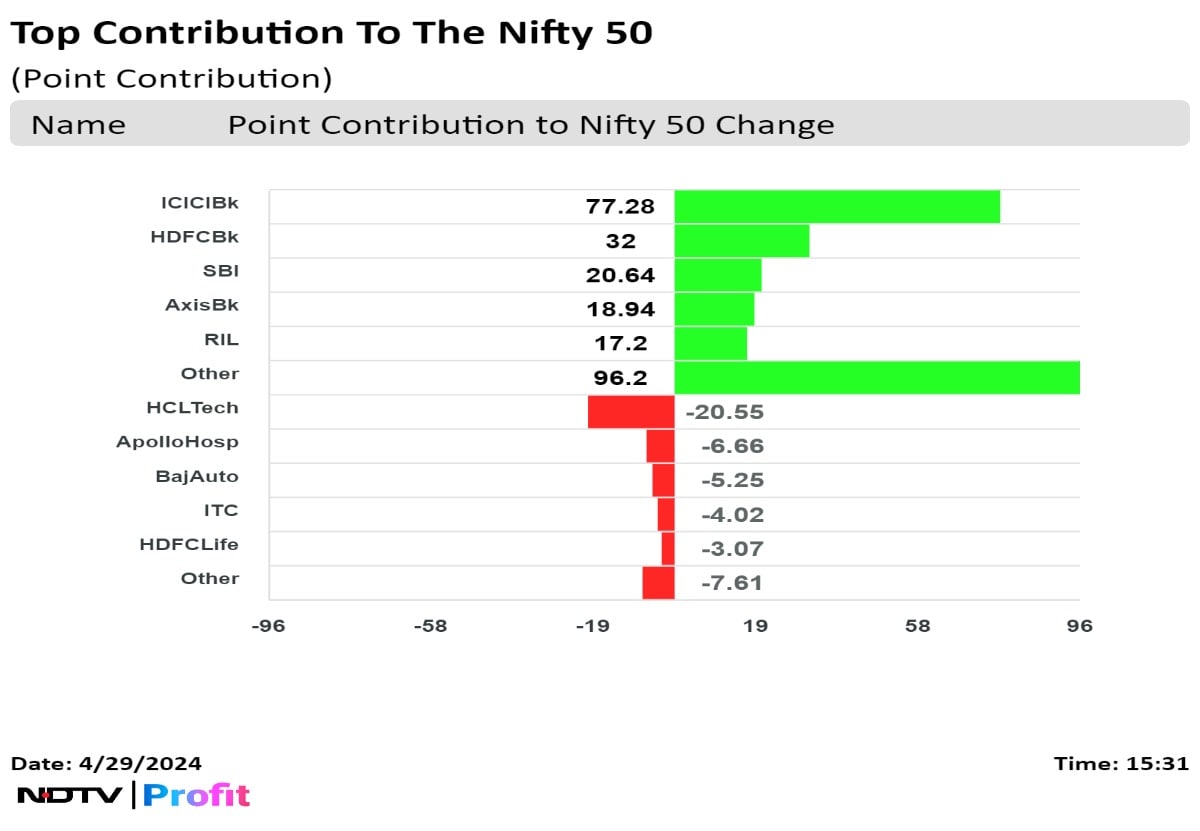 Shares of ICICI Bank Ltd., HDFC Bank Ltd., State Bank Of India, and Axis Bank Ltd., and Reliance Industries Ltd. contributed the most to the Nifty.