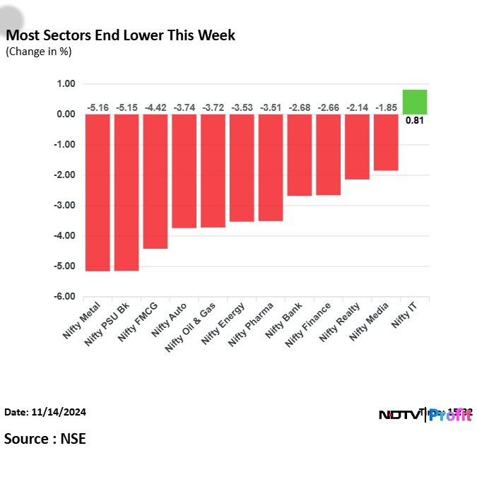 This week, 11 sectors ended lower on the NSE and one ended higher. The Nifty Metal declined the most, while the Nifty IT was the best-performing sector.