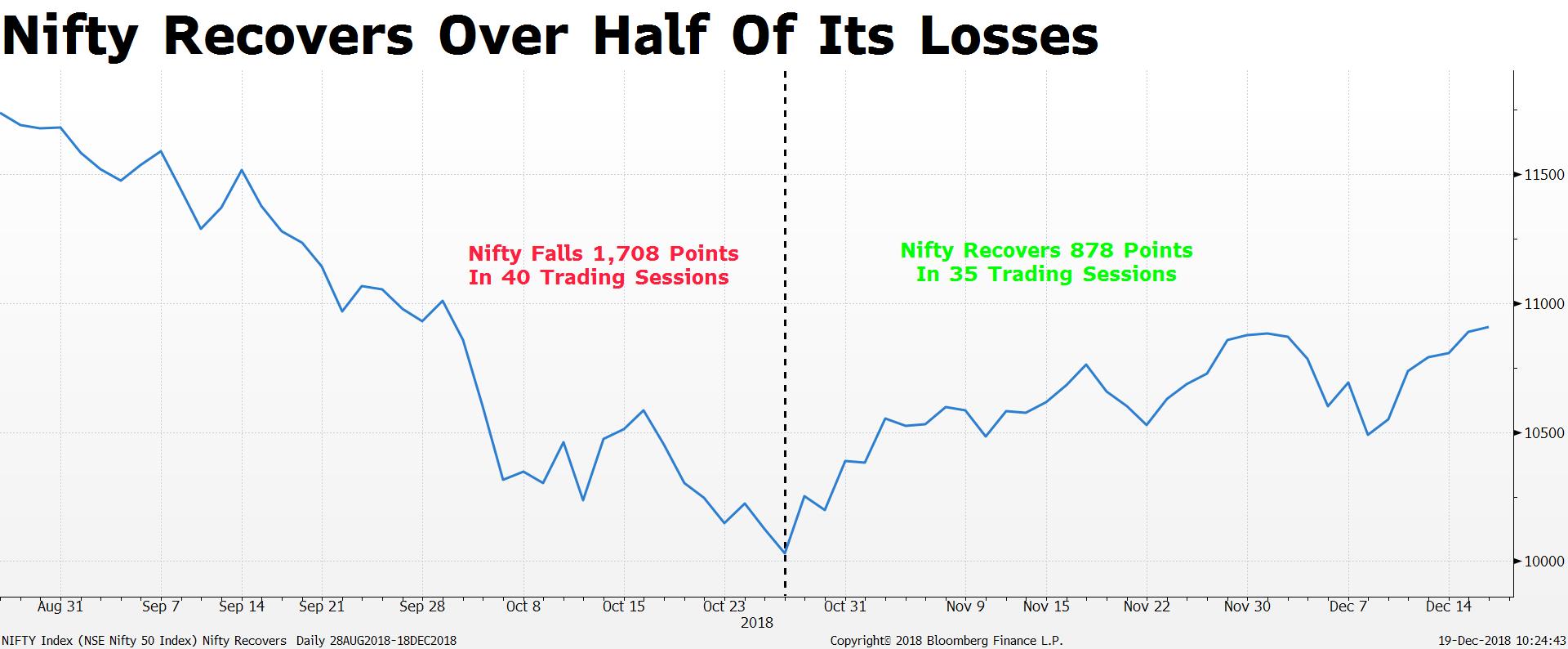 The 50-member stock index had crashed more than 1,700 points since hitting its peak in August after payment defaults at IL&FS Ltd. triggered a liquidity crisis among non-banks lenders, threatening a contagion in financial markets, and uncertainty ahead of the state elections. The differences between the government and the Reserve Bank of India over surplus reserves coming out in the open amid a ballooning bad loan crisis only added to the volatility in the market.