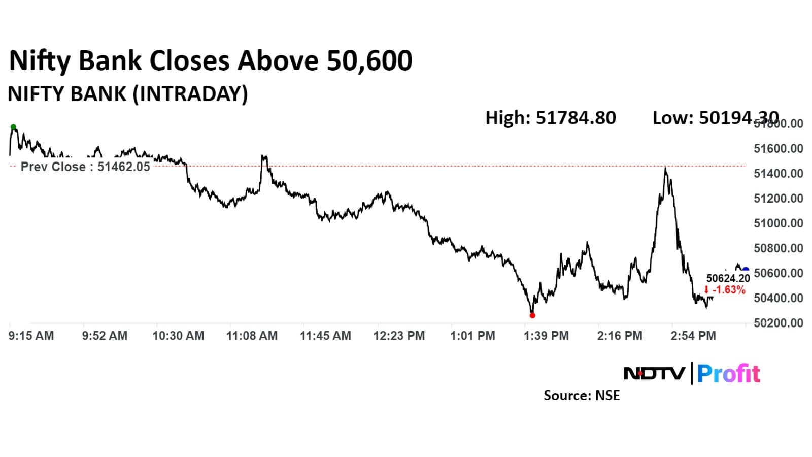 The Nifty Bank ended 1.91% lower at 50,478.90, the lowest closing level since Aug. 19. Intraday, it fell 3.17% to 50,194.30, its lowest level since Aug. 16.