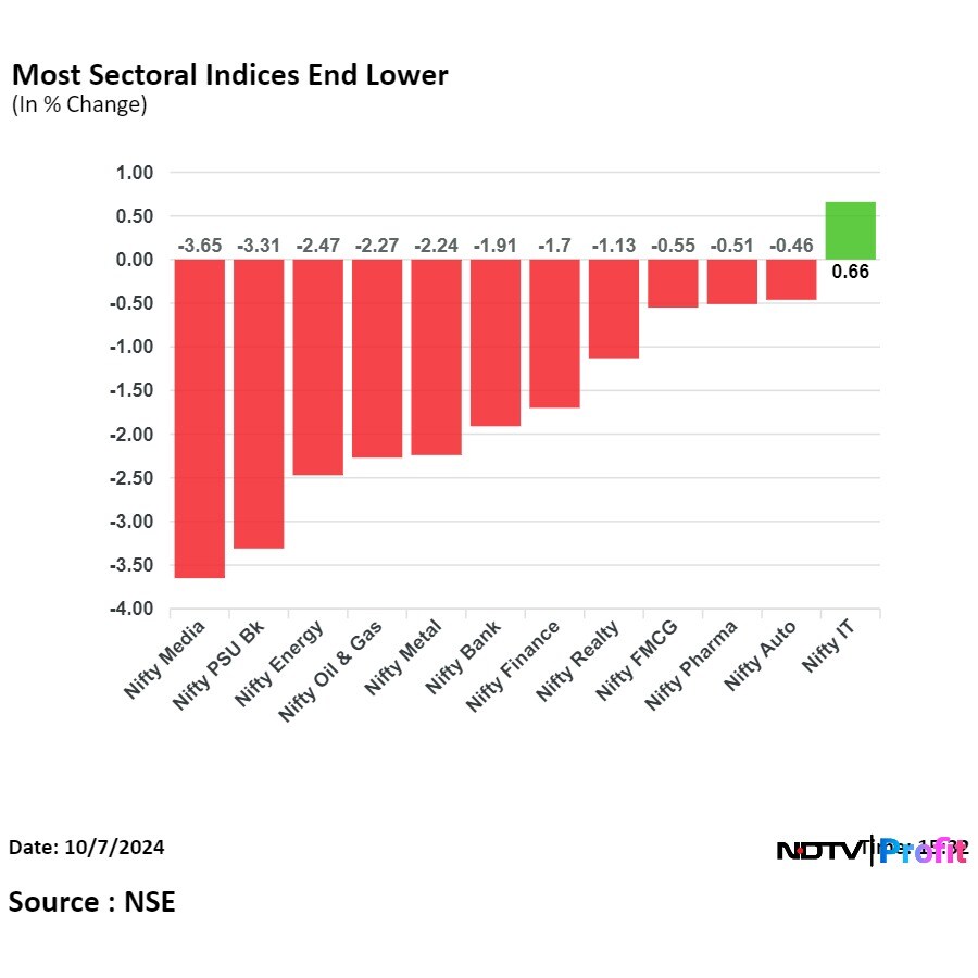 On NSE, 11 out of 12 sectors ended lower and one closed higher. The NSE Nifty Media was the worst performing sector, and the NSE Nifty IT was the top performing sector.