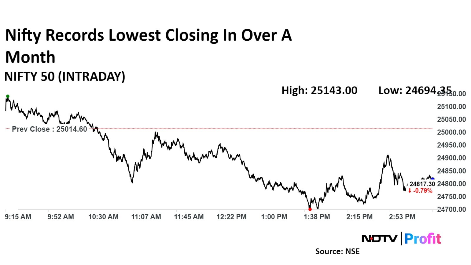 The Nifty 50 ended 218.85 points or 0.87% lower at 24,795.75, and the Sensex closed 638.45 points or 0.78% lower at 81,050.00.