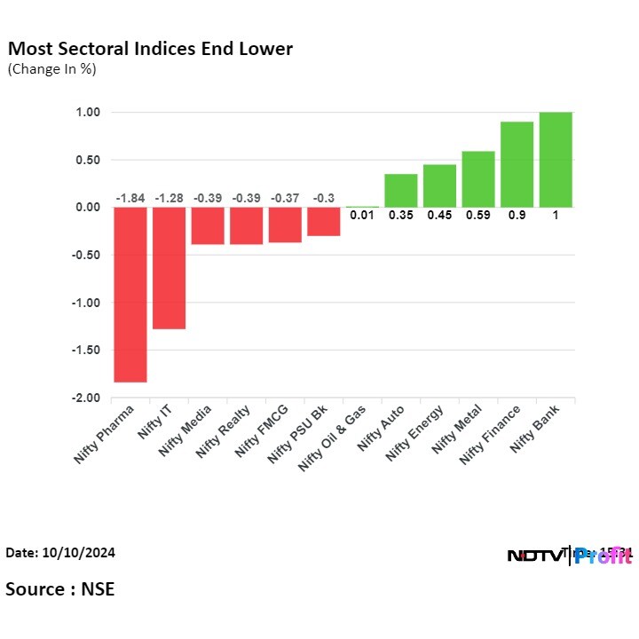 On NSE, most sectoral indices were lower at close. Nifty Pharma fell the most and Nifty Bank was top gainer.