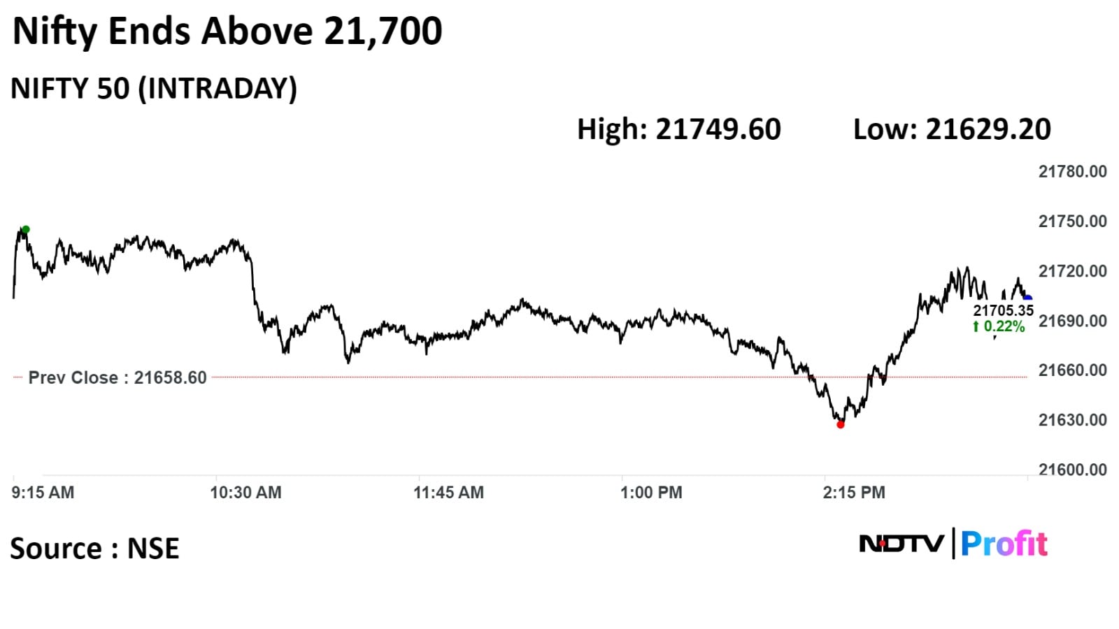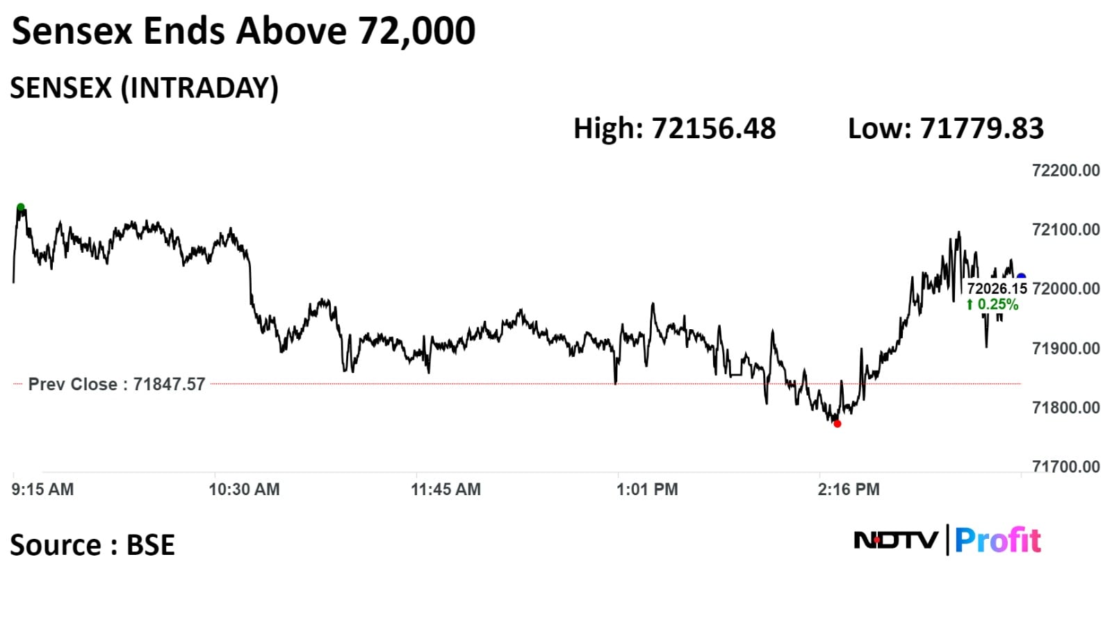 The S&P BSE Sensex closed 179 points or 0.25%, higher at 72,026.15, while the NSE Nifty 50 gained 52 points or 0.24%, to end at 21,710.80.