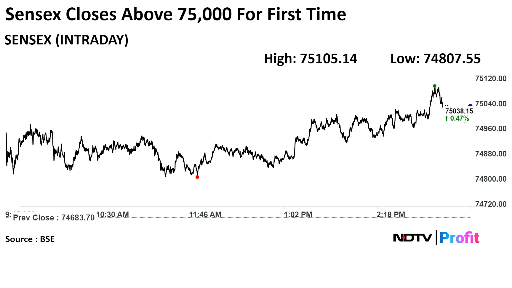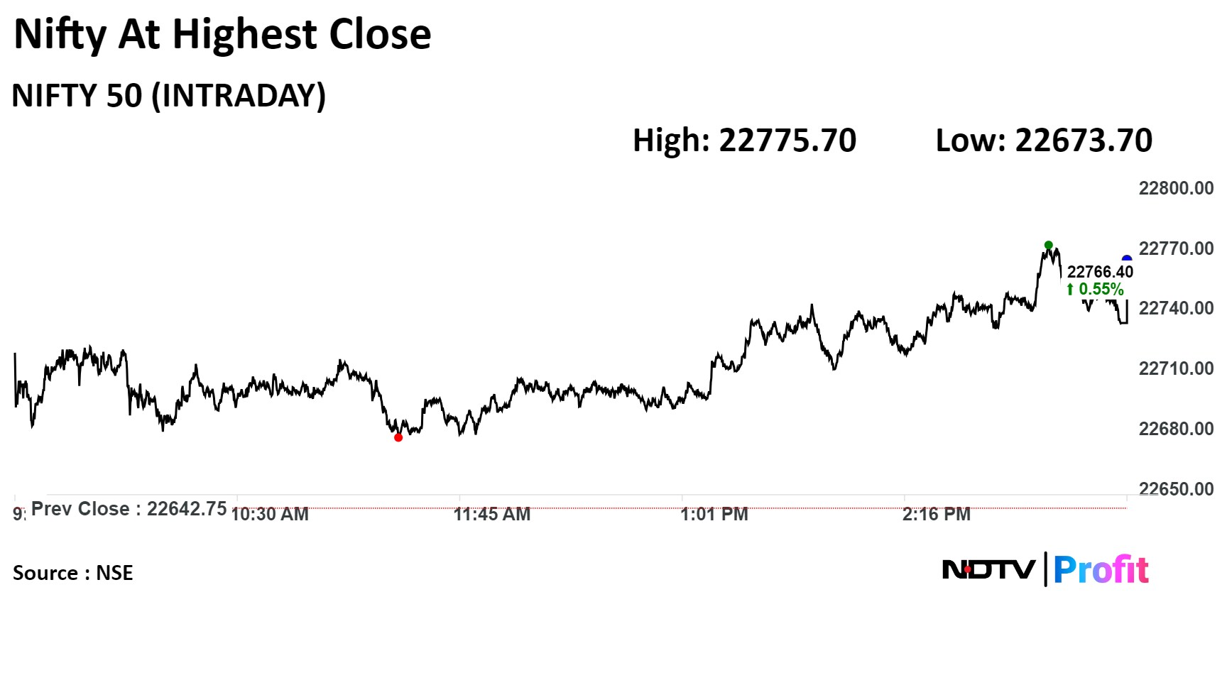 The Nifty closed 111.05 points, or 0.49%, higher at 22,753.80 and the Sensex ended 354.45 points, or 0.47%, up at 75,038.15.