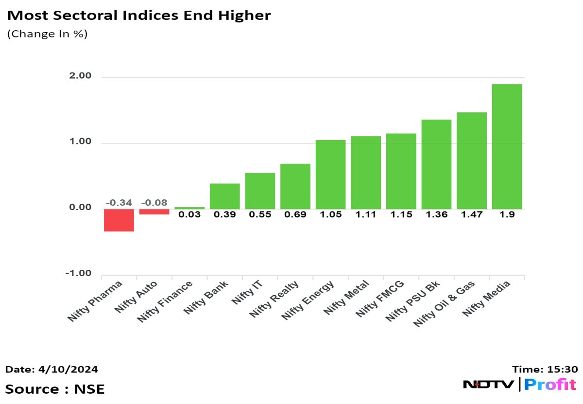 Sectoral indices on the NSE were mostly higher at close, except Nifty Pharma and Nifty Auto, which ended lower. The Nifty Media ended nearly 2% higher.